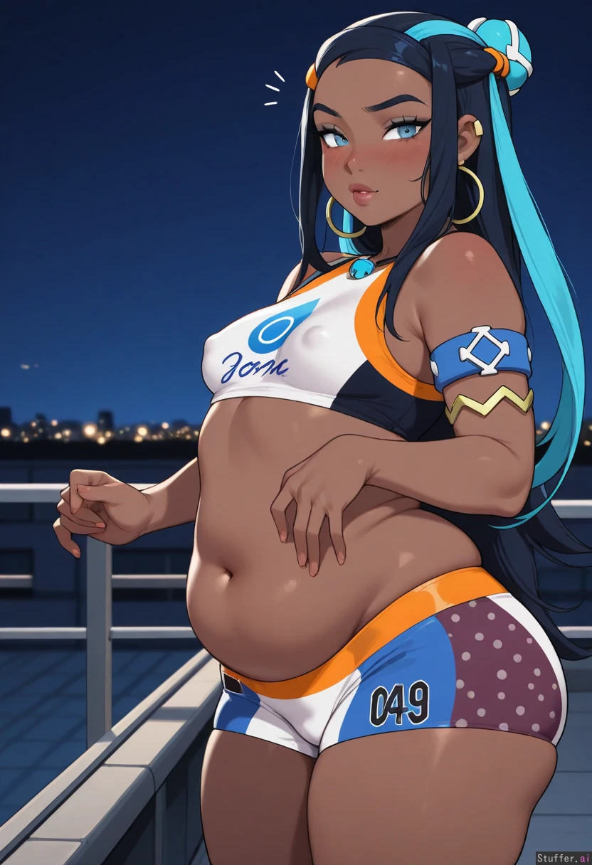 Solo, KAMII MOMORU(artist), ((nessa_pokemon)), horny, ((plump lips)), 1small_breasts, ((thick, chubby:1.2)), (blushing face), (sexy pose, sexy), thick thighs, shy, round belly, standing, on roof, night, small breasts, erect nipples under clothing, side view, Dramatic lighting, ((looking at viewer))