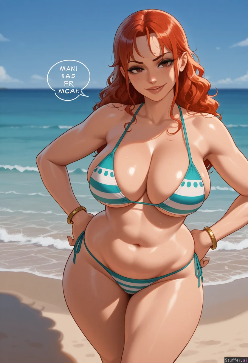 nyantcha:1.2), (krekkov:1.4), (reiq:1.1), (kittew:1.3), best quality, intricate details, hdr, detailed eyes, (soft shading), realistic, dim lighting, realistic lighting, 1woman, (((Mami from One Piece))), ((alt mommy)), wavy_hair, standing in sand, teasing (hands on hips), looking at viewer, flirty, red hair with red highlighted tips, brown eyes, black eyeshadow and eyeliner, lots of freckles, her bangs are red, wide hips, thick thighs, large breasts, (chubby belly:1.2), tummy pooch, legs crossed, smirk, sweet, nave, flushed, ((fat:1.2)), chubby figure, fatass, large protruding belly, Striped cyan bikini top, cyan bikini bottom, gold bracelets, Beach, outside,