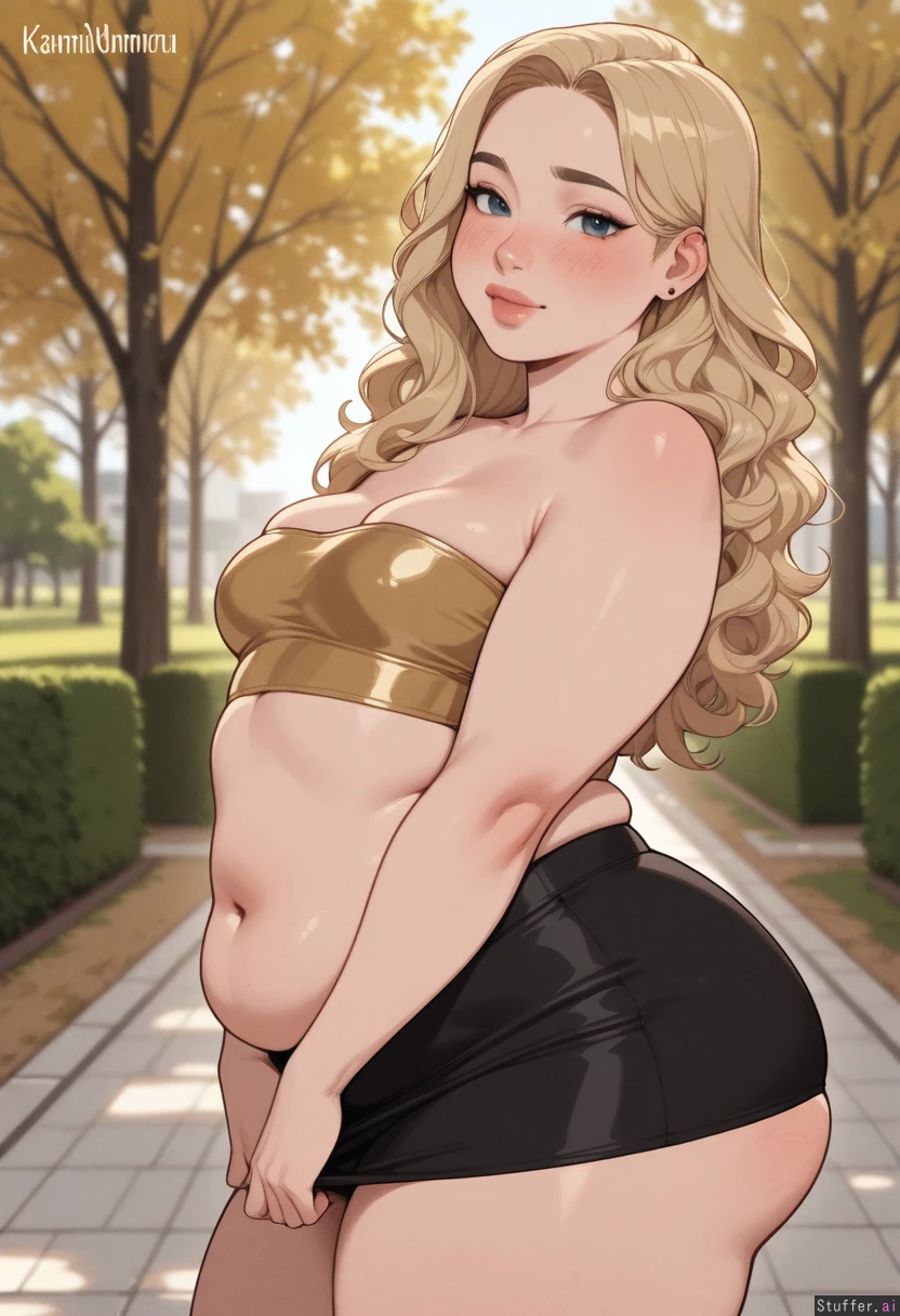 Solo, KAMII MOMORU(artist), ((blonde girl, wavy hair, Beige strapless top, Black skirt, tight fit)), horny, ((plump lips)), 1small_breasts, ((thick, chubby:1.2)), (blushing face), (sexy pose, sexy), thick thighs, shy, round belly, standing, at a park, day, small breasts, side view, Dramatic lighting, ((looking at viewer)), stretchmarks_on_belly