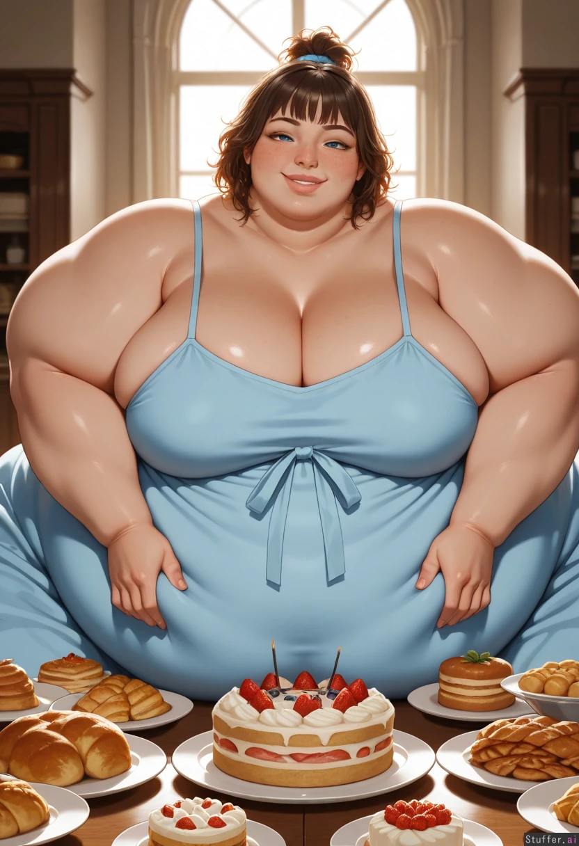 High quality, best rating, high detail, perfect shading, perfect lighting, photorealistic, American ussbbw girl, college aged, fat round face, fat double chin, full lips, freckles, bright blue eyes, long eyelashes, short brunette messy hair, bangs, loose ponytail, seductive smile, (hyper obese:1.5), (hyper obese hips), (hyper obese thighs), (hyper obese belly), (fat arms), Sitting in the back room of a bakery surrounded by cakes and pastries, wearing a blue oversized loose sundress,
