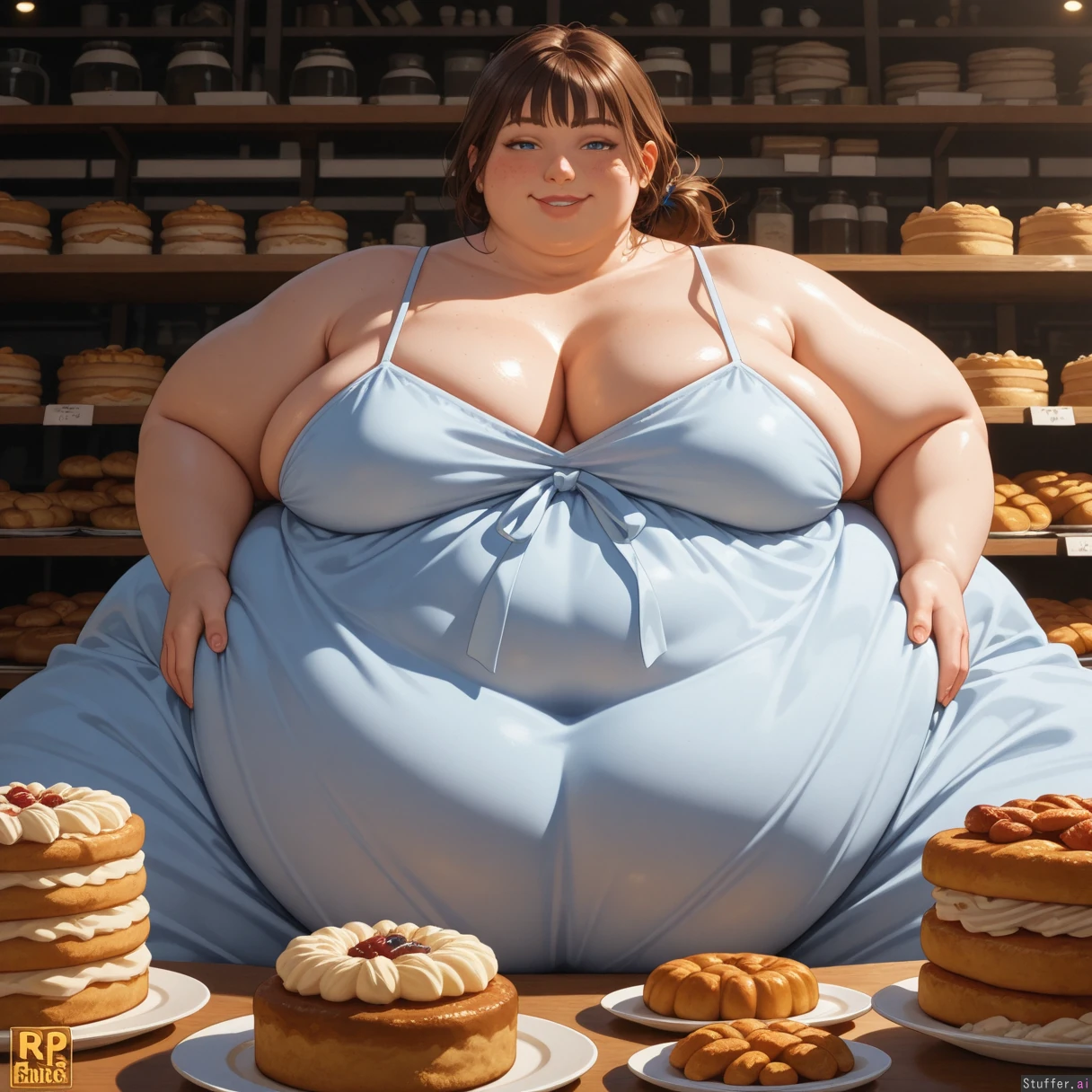High quality, best rating, high detail, perfect shading, perfect lighting, photorealistic, American ussbbw girl, college aged, fat round face, fat double chin, full lips, freckles, bright blue eyes, long eyelashes, short brunette messy hair, bangs, loose ponytail, seductive smile, (hyper obese:1.5), (hyper obese hips), (hyper obese thighs), (hyper obese belly), (fat arms), Sitting in the back room of a bakery surrounded by cakes and pastries, wearing a blue oversized loose sundress,