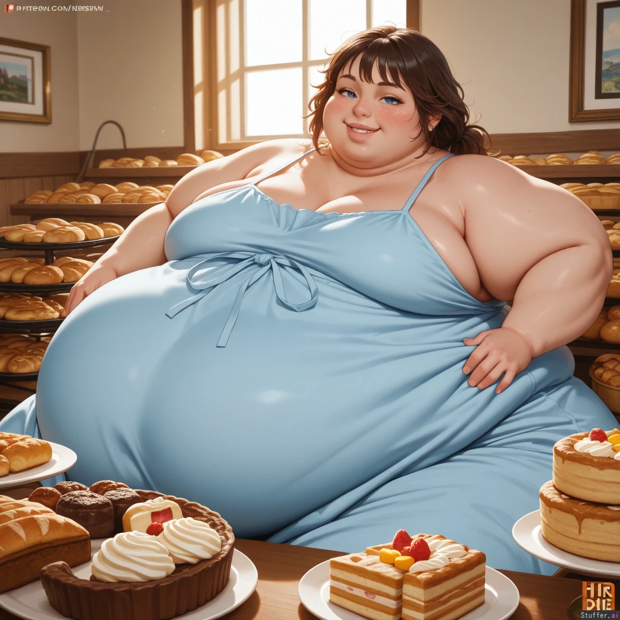 High quality, best rating, high detail, perfect shading, perfect lighting, photorealistic, American ussbbw girl, college aged, fat round face, fat double chin, full lips, freckles, bright blue eyes, long eyelashes, short brunette messy hair, bangs, loose ponytail, seductive smile, (hyper obese:1.5), (hyper obese hips), (hyper obese thighs), (hyper obese belly), (fat arms), Sitting in the back room of a bakery surrounded by cakes and pastries, wearing a blue oversized loose sundress,