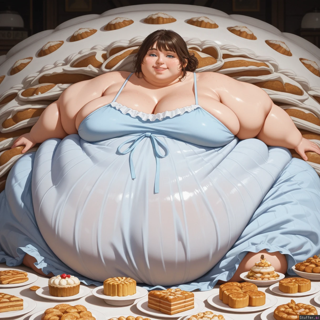 High quality, best rating, high detail, perfect shading, perfect lighting, photorealistic, American ussbbw girl, college aged, fat round face, fat double chin, full lips, freckles, bright blue eyes, long eyelashes, short brunette messy hair, bangs, loose ponytail, seductive smile, (hyper obese:1.6), (hyper obese hips:1.4), (hyper obese thighs:1.4), (hyper obese belly:1.4), (fat arms), Sitting in the back room of a bakery surrounded by cakes and pastries, wearing a blue oversized loose sundress,