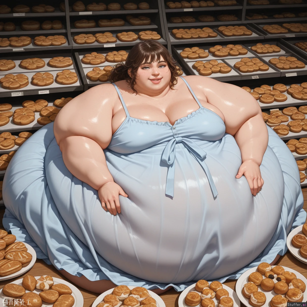 High quality, best rating, high detail, perfect shading, perfect lighting, photorealistic, American ussbbw girl, college aged, fat round face, fat double chin, full lips, freckles, bright blue eyes, long eyelashes, short brunette messy hair, bangs, loose ponytail, seductive smile, (hyper obese:1.6), (hyper obese hips:1.4), (hyper obese thighs:1.4), (hyper obese belly:1.4), (fat arms), Sitting in the back room of a bakery surrounded by cakes and pastries, wearing a blue oversized loose sundress,