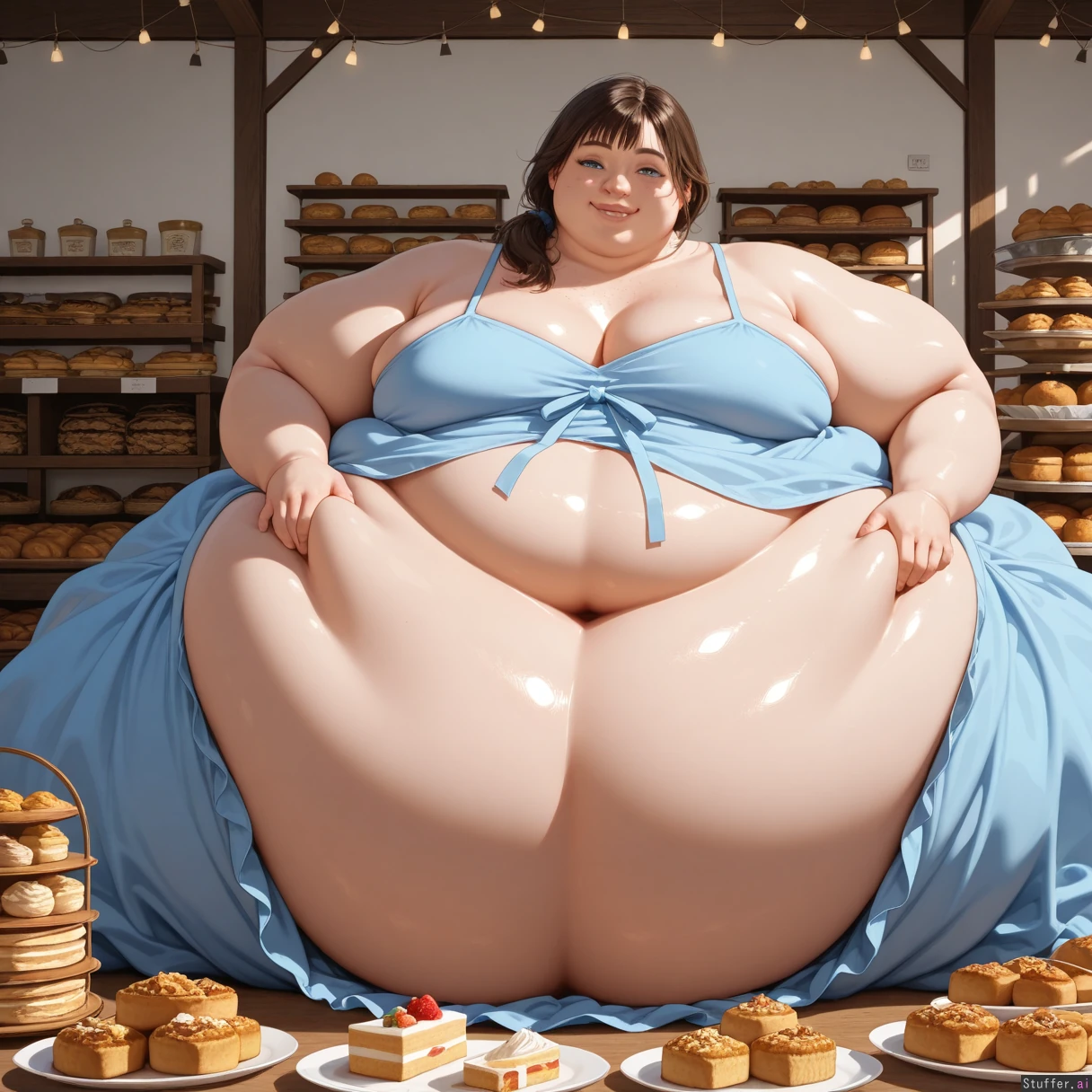 High quality, best rating, high detail, perfect shading, perfect lighting, photorealistic, American ussbbw girl, college aged, fat round face, fat double chin, full lips, freckles, bright blue eyes, long eyelashes, short brunette messy hair, bangs, loose ponytail, seductive smile, (hyper obese:1.6), (hyper obese hips:1.4), (hyper obese thighs:1.4), (hyper obese belly:1.4), (fat arms), Sitting in the back room of a bakery at a table covered with cakes and pastries, wearing a blue oversized loose sundress,