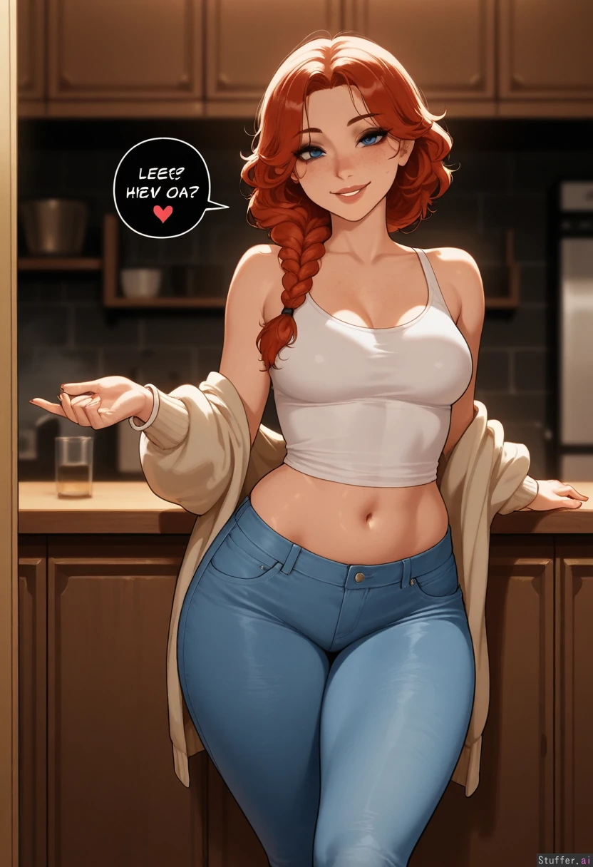 nyantcha:1.2), (krekkov:1.4), (reiq:1.1), (kittew:1.3), best quality, intricate details, hdr, detailed eyes, (soft shading), realistic, dim lighting, realistic lighting, 1woman, (( alt mommy)), low braided ponytail wavy_hair, standing, teasing (tilting head), looking at viewer, flirty, red hair with red highlighted tips, dark blue eyes, black eyeshadow and eyeliner, lots of freckles, her bangs are red, wide hips, thick thighs, medium breasts, (thin belly:0.2), tummy pooch, legs crossed, happy, sweet, nave, flushed, ((fit:0.5)), slim figure, fatass, White tank top, beige cardigan, low-rise blue jeans, white bracelets, German bar, inside,