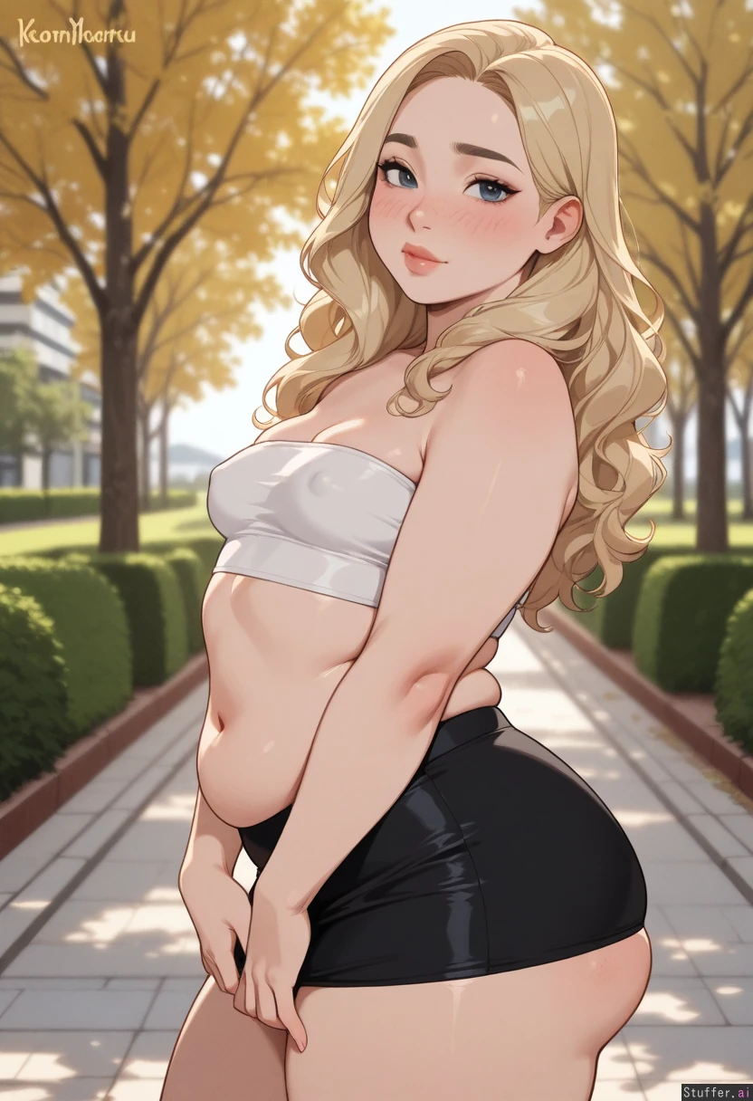 Solo, KAMII MOMORU(artist), ((blonde girl, wavy hair, white strapless top, Black skirt, tight fit)), horny, ((plump lips)), 1small_breasts, ((thick, chubby:0.0)), (blushing face), (sexy pose, sexy), thick thighs, shy, round belly, standing, at a park, day, small breasts, side view, Dramatic lighting, ((looking at viewer)), stretchmarks:1.7, erect_nipples