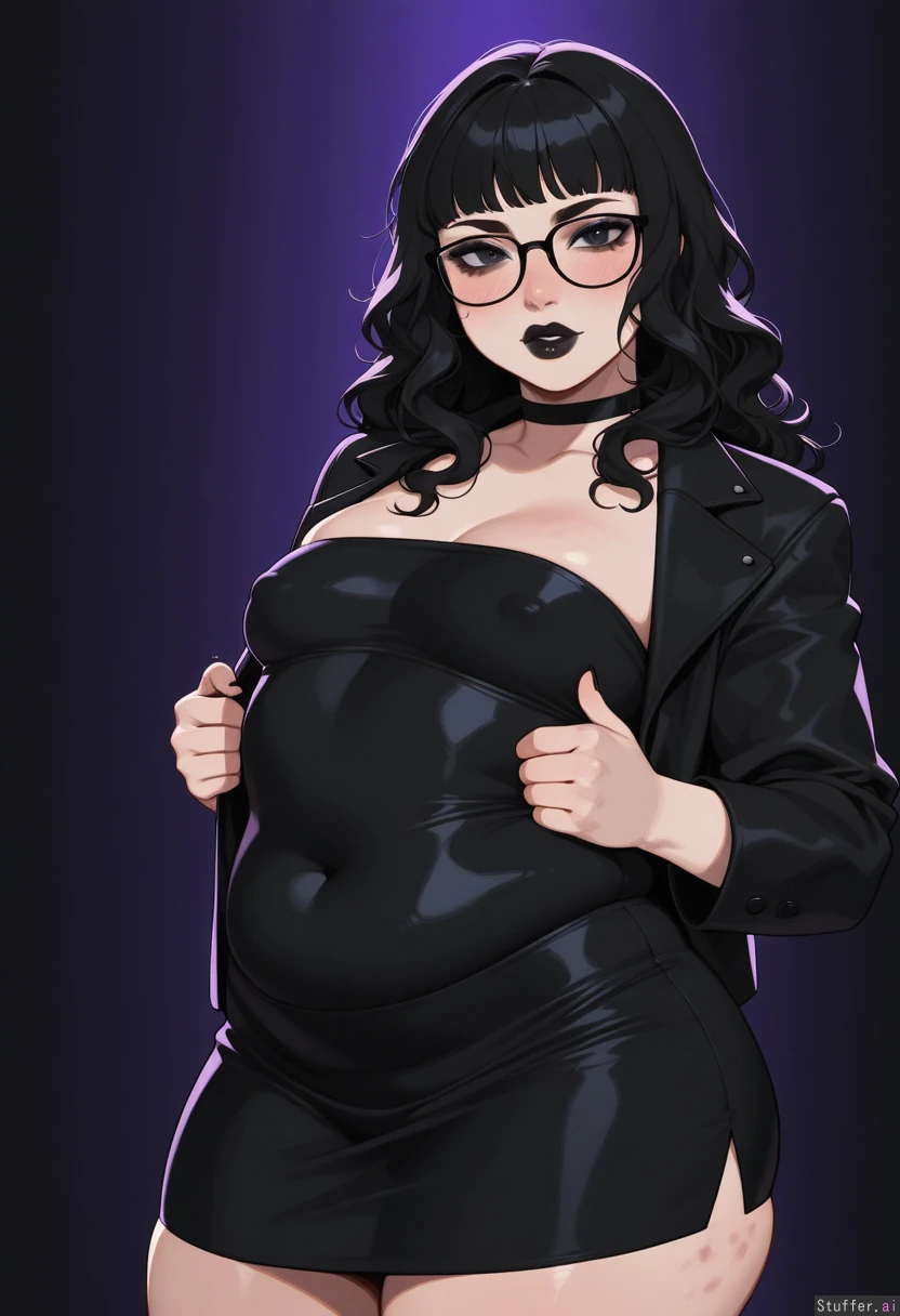 Solo, KAMII MOMORU(artist), ((goth girl, black hair, short wavy hair, white strapless top, black glasses, short black jacket ,Black skirt, tight fit)), ((plump lips, Black lipstick, gothic makeup)), 1small_breasts, ((thick, chubby:1.04)), (blushing face), (sexy pose, sexy), thick thighs, horny, round belly, standing, at a park, day, small breasts, side view, Dramatic lighting, ((looking at viewer)), stretchmarks:1.7, erect_nipples