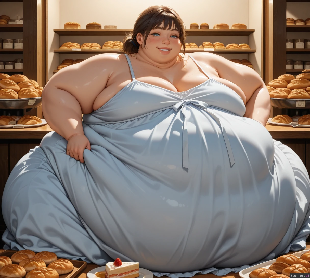 High quality, best rating, high detail, perfect shading, perfect lighting, photorealistic, American ussbbw girl, college aged, fat round face, fat double chin, full lips, freckles, bright blue eyes, long eyelashes, short brunette messy hair, bangs, loose ponytail, seductive smile, (hyper obese:1.5), (hyper obese hips), (hyper obese thighs), (hyper obese belly:1.4), (fat arms), Sitting in the back room of a bakery at a table covered with cakes and pastries, wearing a blue oversized loose sundress,