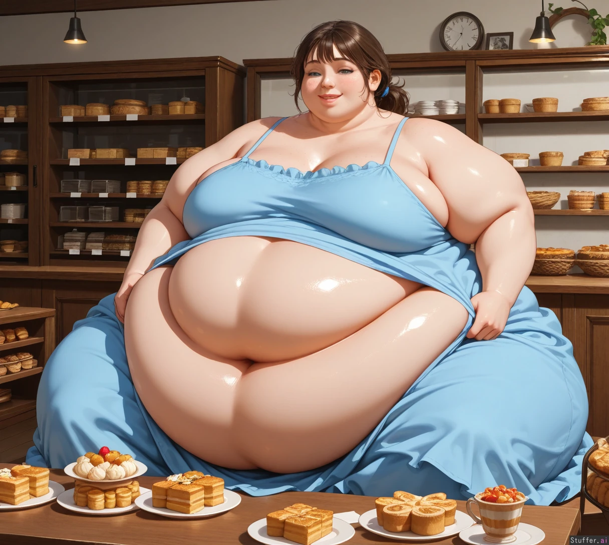 High quality, best rating, high detail, perfect shading, perfect lighting, photorealistic, American ussbbw girl, college aged, fat round face, fat double chin, full lips, freckles, bright blue eyes, long eyelashes, short brunette messy hair, bangs, loose ponytail, seductive smile, (hyper obese:1.5), (hyper obese hips), (hyper obese thighs), (hyper obese belly:1.4), (fat arms), Sitting in the back room of a bakery at a table covered with cakes and pastries, wearing a blue oversized loose sundress,