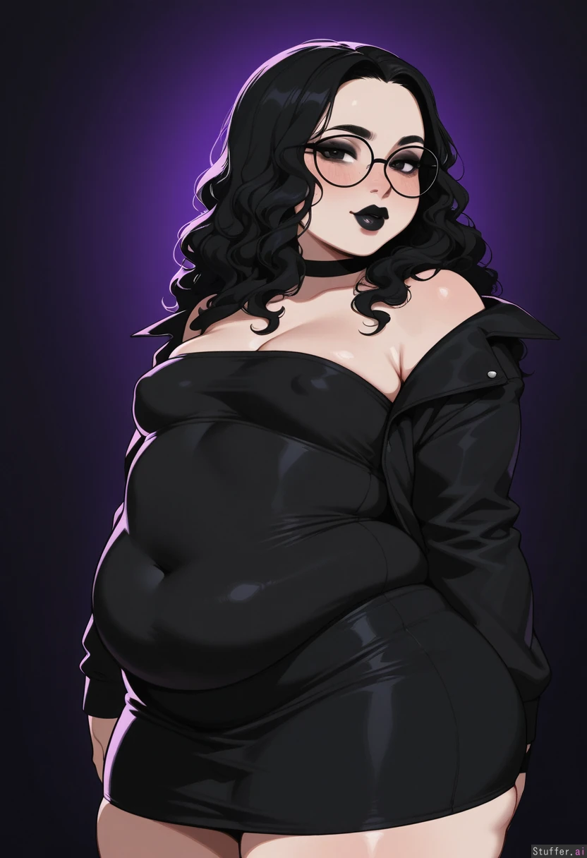 Solo, KAMII MOMORU(artist), ((goth girl, black hair, short wavy hair, white strapless top, black glasses, short black jacket ,Black skirt, tight fit)), ((plump lips, Black lipstick, gothic makeup)), 1small_breasts, ((thick, chubby:1.44)), (blushing face), (sexy pose, sexy), thick thighs, horny, round belly, standing, at a park, day, small breasts, side view, Dramatic lighting, ((looking at viewer)), stretchmarks:1.7, erect_nipples