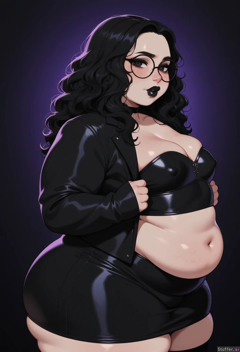 Solo, KAMII MOMORU(artist), ((goth girl, black hair, short wavy hair, white strapless top, black glasses, short black jacket ,Black skirt, tight fit)), ((plump lips, Black lipstick, gothic makeup)), 1small_breasts, ((thick, chubby:1.79)), (blushing face), (sexy pose, sexy), thick thighs, horny, round belly, standing, at a park, day, small breasts, side view, Dramatic lighting, ((looking at viewer)), stretchmarks:1.7, erect_nipples