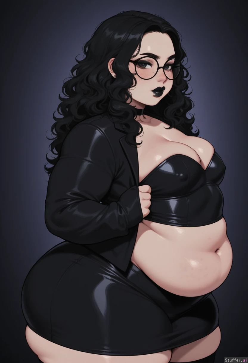 Solo, KAMII MOMORU(artist), ((goth girl, black hair, short wavy hair, white strapless top, black glasses, short black jacket ,Black skirt, tight fit)), ((plump lips, Black lipstick, gothic makeup)), 1small_breasts, ((thick, chubby:2.05)), (blushing face), (sexy pose, sexy), thick thighs, horny, round belly, standing, at a park, day, small breasts, side view, Dramatic lighting, ((looking at viewer)), stretchmarks:1.7, erect_nipples