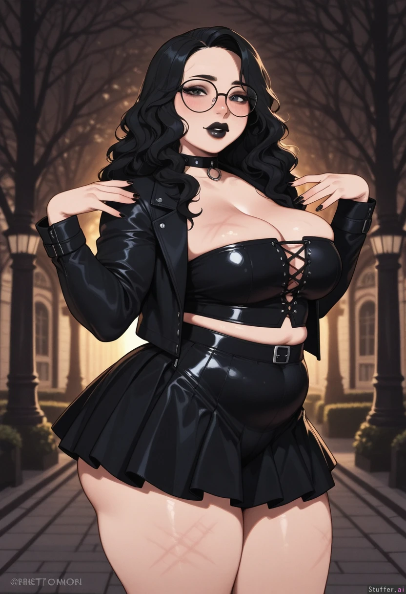 Solo, KAMII MOMORU(artist), ((goth girl, black hair, short wavy hair, micro black strapless top, black glasses, black jacket ,Black skirt, tight fit)), ((plump lips, Black lipstick, gothic makeup)), ((thick, chubby:0.0)), (blushing face), (sexy pose, sexy), thick thighs, horny, round belly, standing, at a park, day, heavy breasts, side view, Dramatic lighting, ((looking at viewer)), (stretchmarks:1.7), (sagging_breasts:0.9), (breasts_overflowing_clothing:1.7)