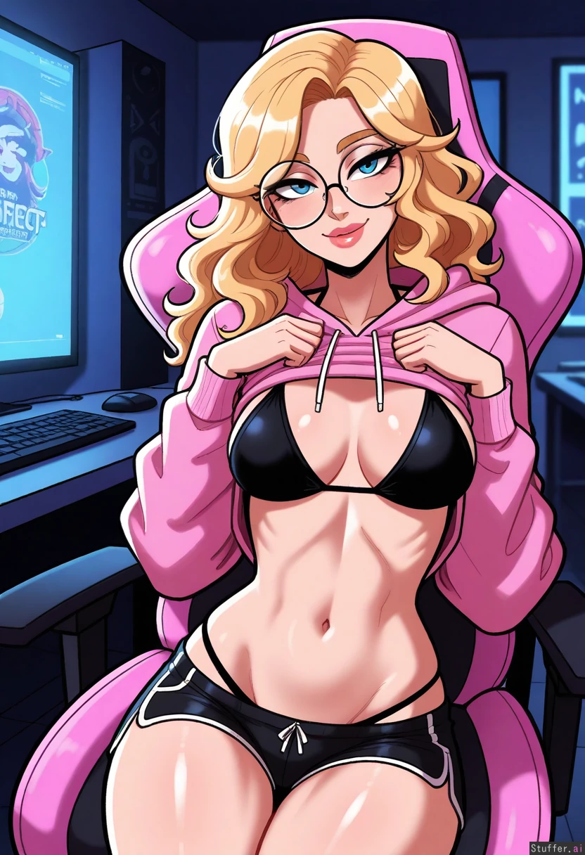 Solo, scruffyturtles(artist), perfect proportions, supermodel face, sexy, ((realistic, detailed)) Long blonde hair, wavy hair, blonde eyebrows, blue eyes, black eye liner, (pink hoodie), (black string bikini top), (black shorts), (round glasses) ((Skinny body)), (medium breasts), ((skinny hips)), ((skinny thighs)) (In gaming room), sitting in gamer chair, (flirty smile), sexy pose, big lips