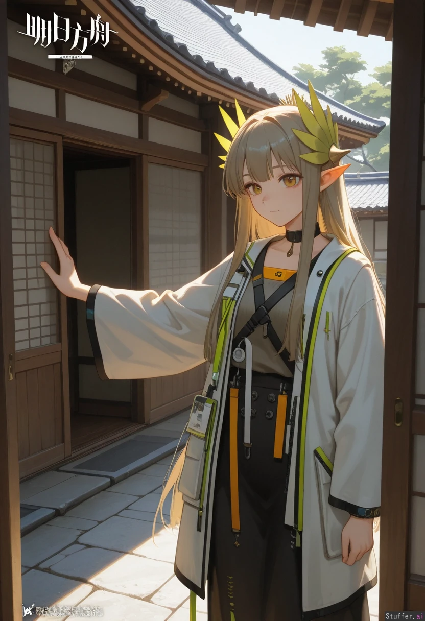 1girl, Muelsyse (arknights), perfect quality, best quality, absolutely eye-catching, Yao Liao Wang, oastlv, Standing, Japanese house,