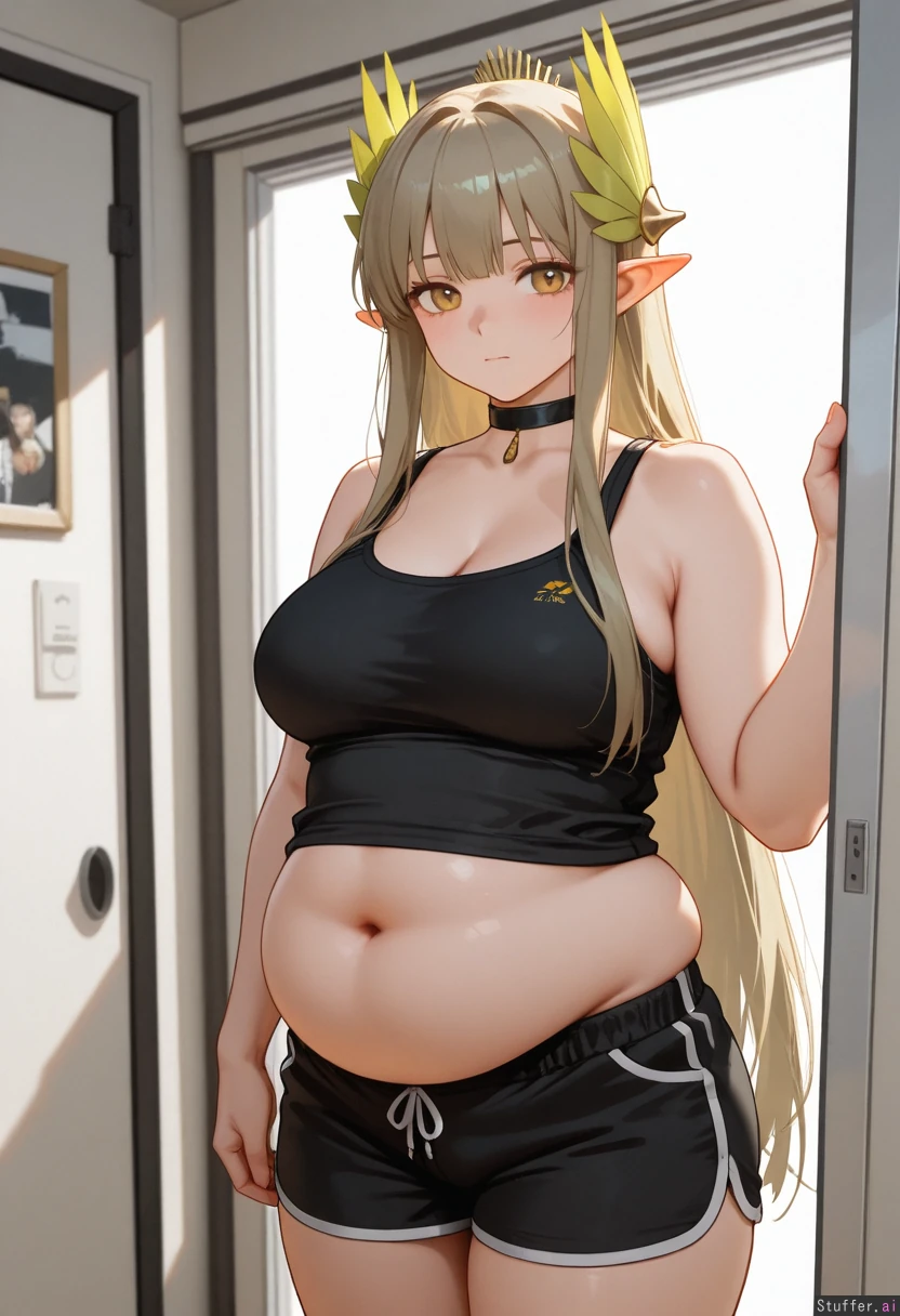 1girl, Muelsyse (arknights), perfect quality, best quality, absolutely eye-catching, Yao Liao Wang, oastlv, Tank top, plump, fat, bloated, Standing,