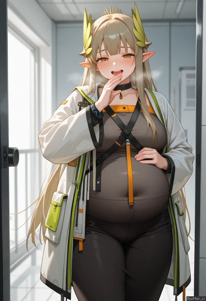 1girl, Muelsyse (arknights), perfect quality, best quality, absolutely eye-catching, Yao Liao Wang, oastlv, , clothed, obese, plump, covered belly, Standing, out of breath, torogao, laughing,