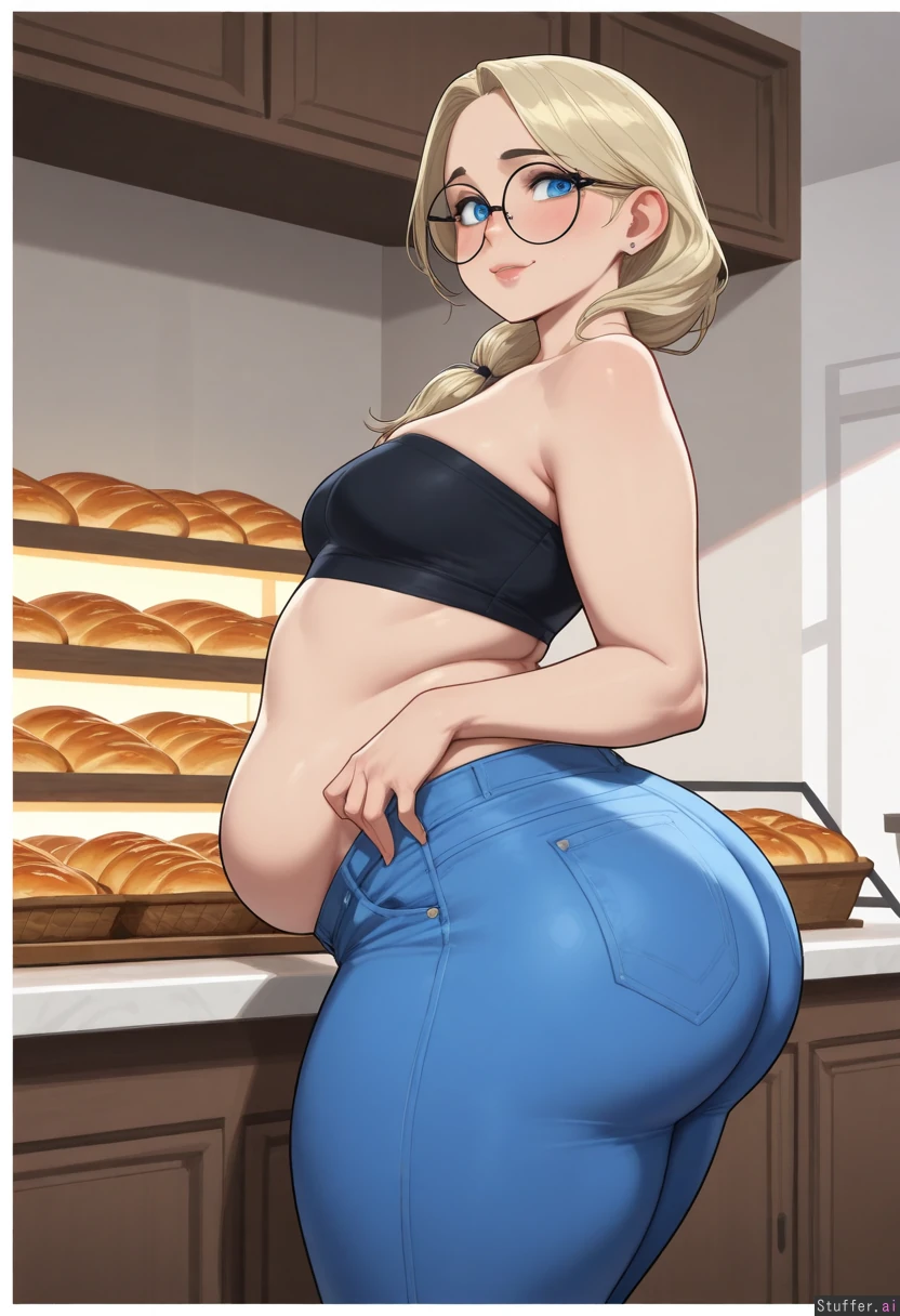 (highly detailed, best quality), (perfect anatomy, perfect proportions), (perfect lighting, warm lighting, vibrant colors, shadow, perfect shading), (beautiful face, beautiful eyes), (Krekkov(artist), KAMII MOMORU(artist)), (solo), (bakery), (((Gorgeous girl, blonde hair, blue eyes, adult, mature, big glasses, round face))), ((Black tube top, midriff, blue jeans)) ((Beautiful face, raised eyebrows ((small butt)) (((Huge_ass, plump_belly, huge_hips, huge thighs, fat:1.5))), (((small breasts)))