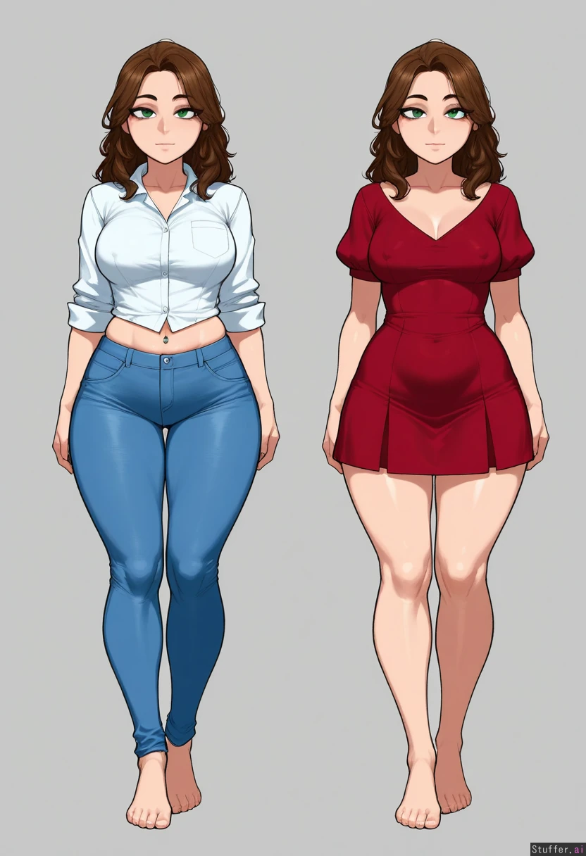 Krekkov_artist, KipKipTei_artist, beautiful_shading, highly_detailed, best_quality, perfect_anatomy, perfect_proportions, perfect_lighting, soft_lighting, adult, Long_wavy_brown_hair, green_eyes, Mascara, navel_piercing, smaller breasts, Red dress shirt, blue jeans, bare feet, whole body in view, Nipple outline, (Bloated belly: 0.0 ) (Hourglass_inflation: 0.5 ) (Swollen body: 0.0 ) (Soft : 0.4 )