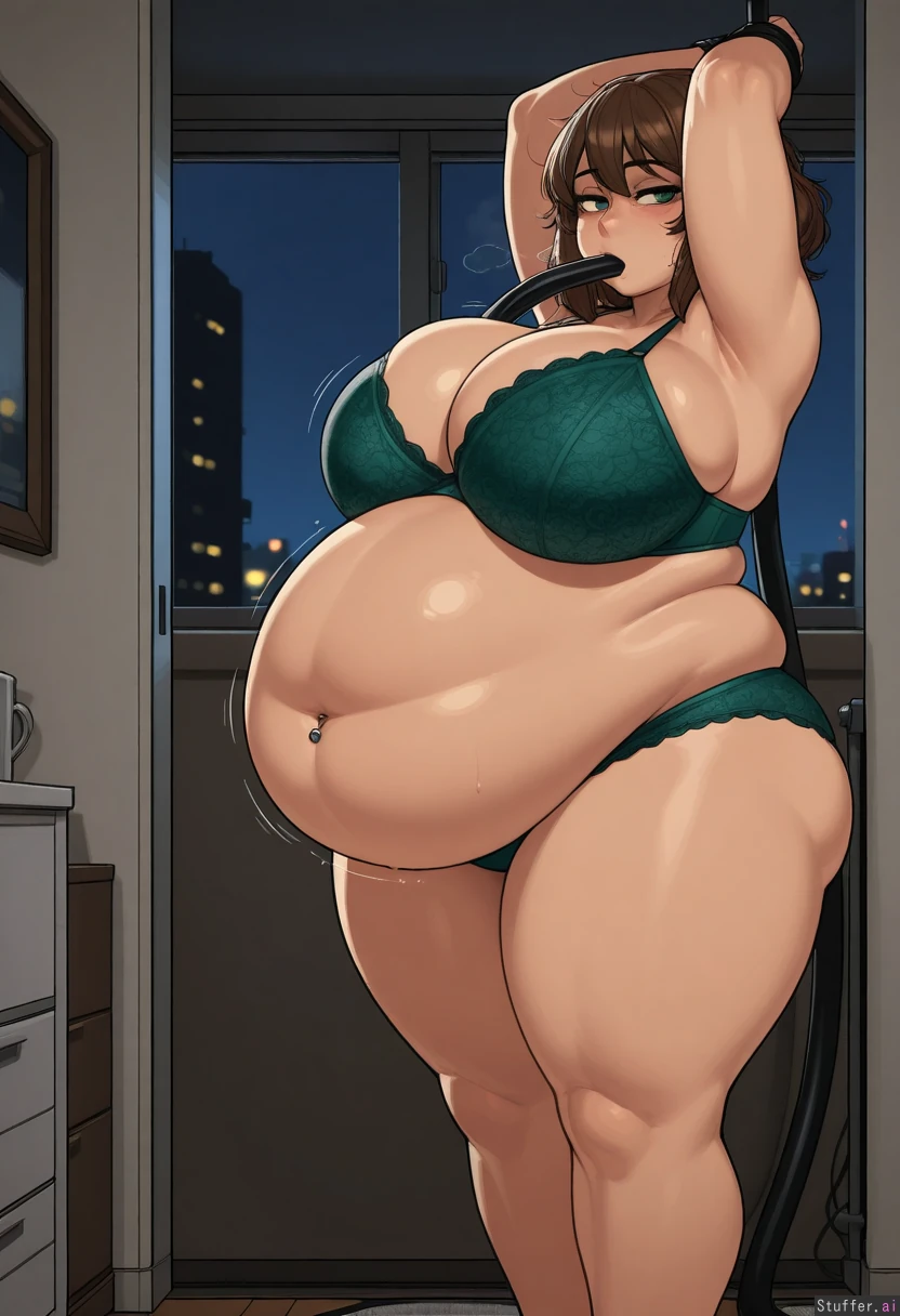 Krekkov_artist, KipKipTei_artist, beautiful_shading, highly_detailed, best_quality, perfect_anatomy, perfect_proportions, perfect_lighting, soft_lighting, adult, 1girl, solo, Long_wavy_brown_hair, green_eyes, Mascara, navel_piercing, green lace bra and panties, bare feet, whole body in view, standing, cozy room, apartment, night time, candlelight, hands tied together, arms restrained above her head, seductive, aroused expression, black hose in mouth, sucking on hose, motion lines, side_view, breasts spilling out, belly hang, Nipple outline, (Obesity:1.75)