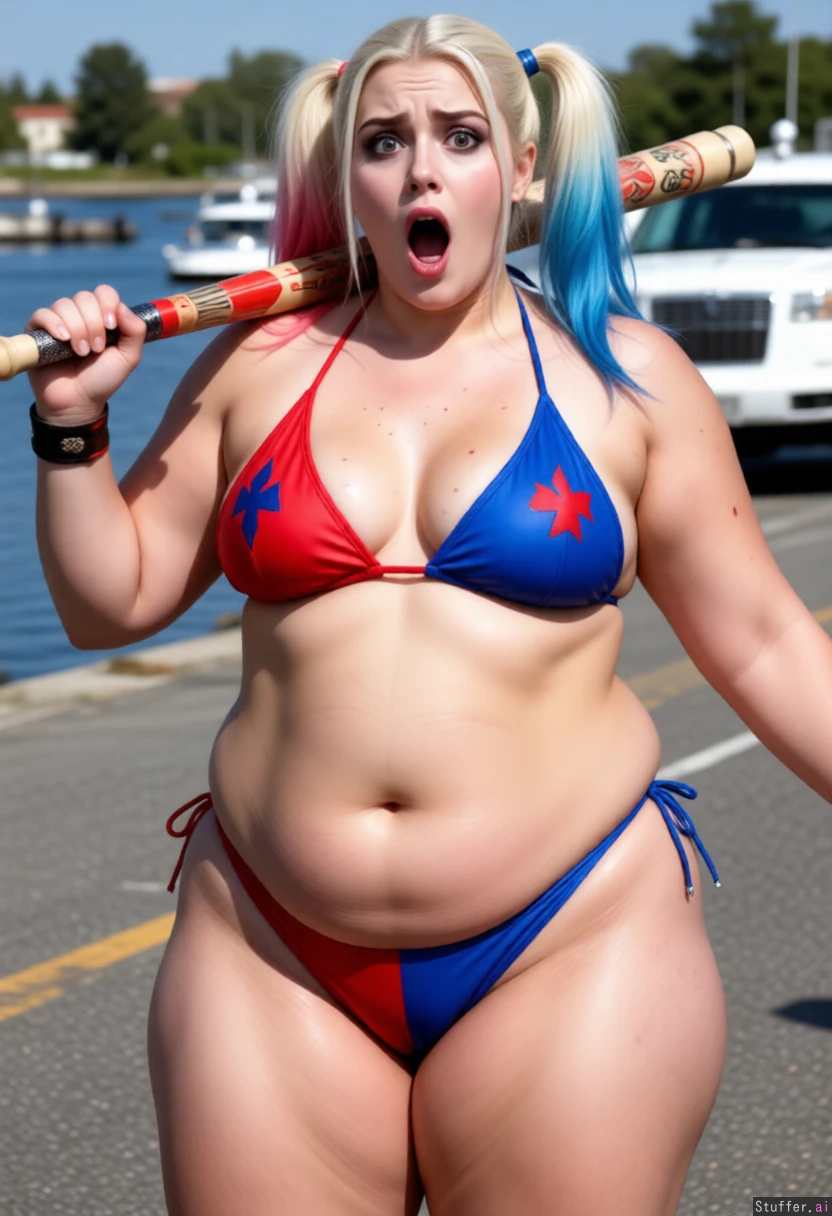 Obese Harley Quinn, shocked, cellulite, bikini. love_handles, wide hips