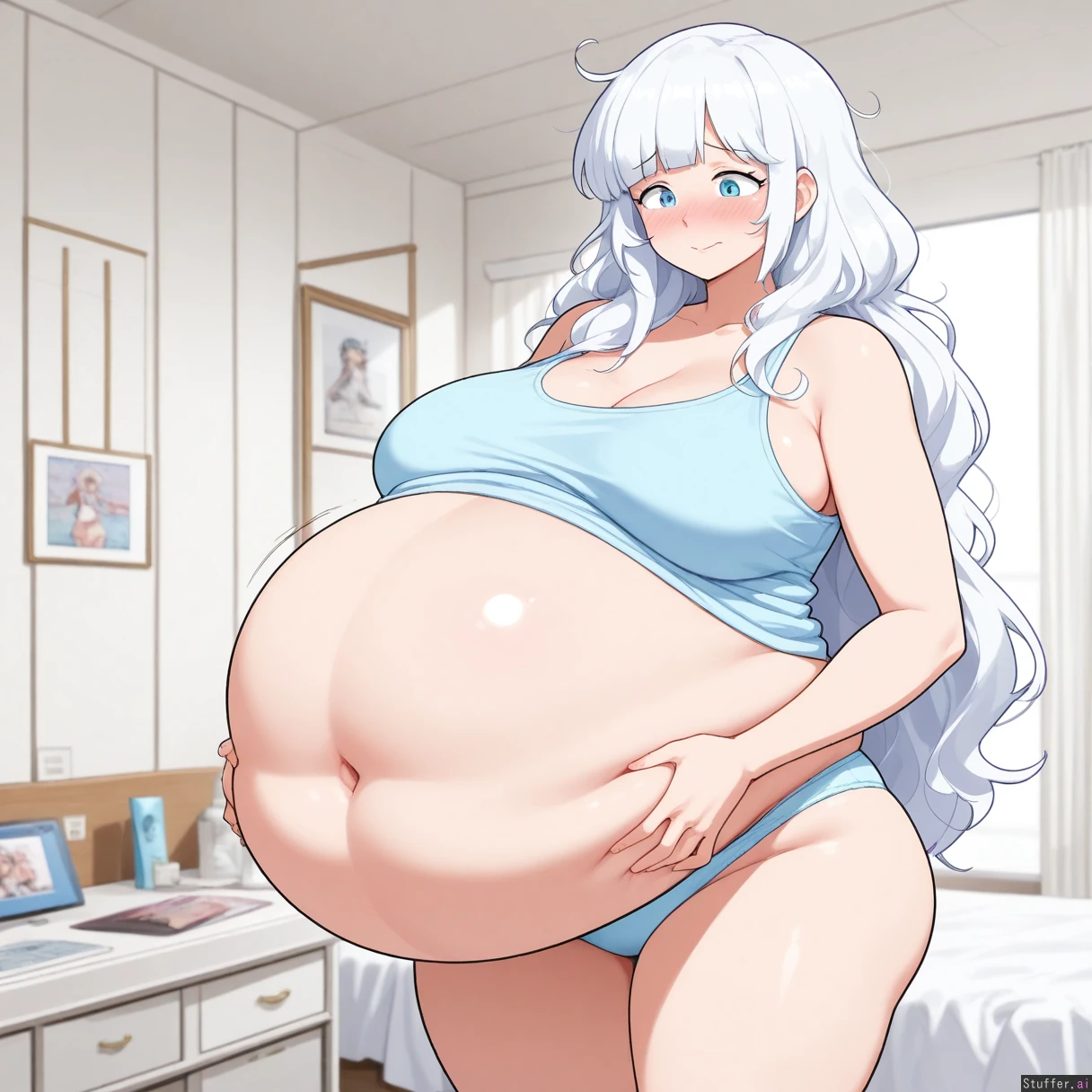8k, perfect anatomy, masterpiece, beautiful face, beautiful eyes, ((theycallhimcake)), ((lewdlemage)), ((napolitane)), ((softservice)) ((Solo)) ((Bedroom, morning)) ((Messy white hair, blue eyes, long hair, fluffy bangs)), (((mature))) ((Light blue tank top, light blue panties)) ((Embarrassed)) ((Standing, squeezing belly)) ((((huge belly, full belly))))