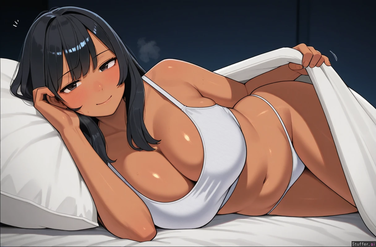 artist ohasi_art, artist habutton, perfect quality,long hair, 8k , beautiful, solo, black hair, brown eyes, tan skin, Asian eyes, out of breath, looking at viewer , deep cleavage , flirty ,, chubby face, bbw, In white crop top, laying on side in bed