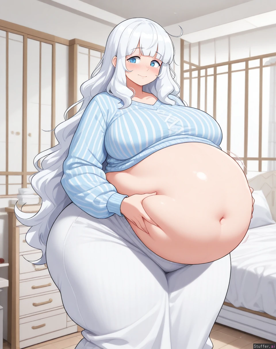 8k, perfect anatomy, masterpiece, beautiful face, beautiful eyes, ((theycallhimcake)), ((lewdlemage)), ((napolitane)), ((softservice)) ((Solo)) ((Bedroom, morning)) ((Messy white hair, blue eyes, long hair, fluffy bangs)), (((mature))) ((Light blue comfy clothes)) ((Embarrassed)) ((Standing, squeezing belly)) ((((huge belly, full belly)))) ((Huge hips, huge butt))