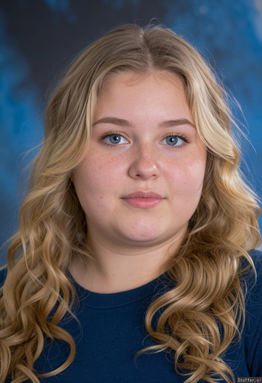 21-year-old Dutch girl, blonde, wavy-hair, chubby_cheeks, fat_face, double_chin, prety_eyes, blue_eyes, posing_for_a-school_picture yearbook-photo 4k-masterpiece, best-quality, highly-detailed, bokeh, blurry-background
