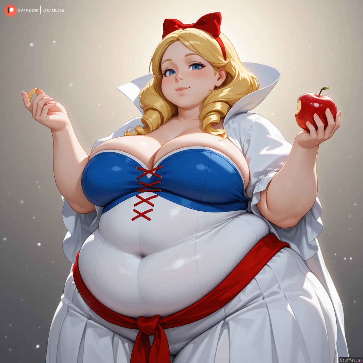 Beautiful shading, highly detailed, best quality, perfect anatomy, perfect proportions, perfect lighting, (best quality), (high rating), absurd res, high res, detailed, ultra quality, ((high quality)), masterpiece, (ultra high resolution), anime style, stunning beauty, detailed face, intricate detail, sophisticated detail, 1girl, exquisite detail, absurd resolution, correct anatomy, 8k, (highly detailed face), highly detailed skin texture, gradient background, Snow_White(Disney), eating apple, (obese:1.15)
