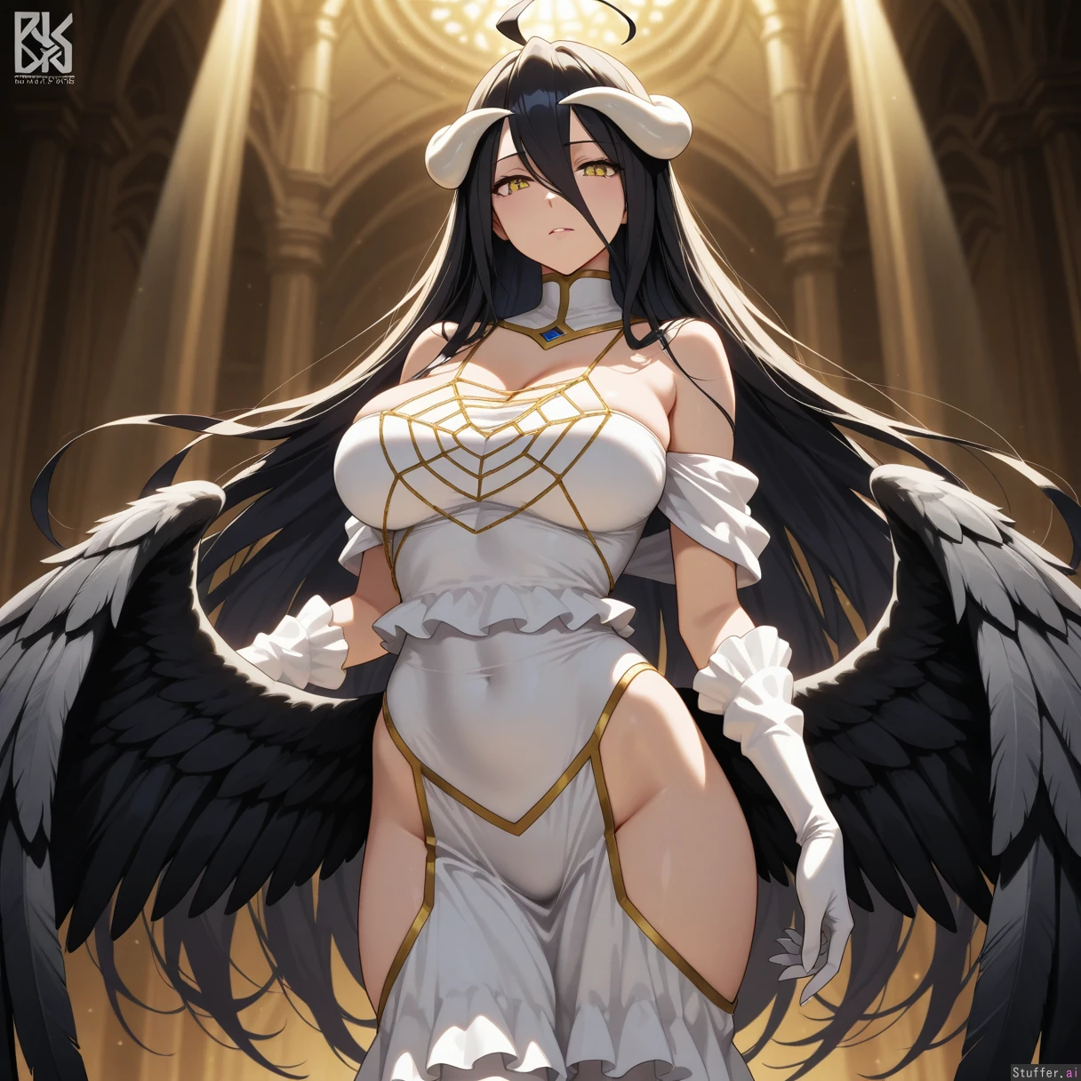 Beautiful shading, highly detailed, best quality, perfect anatomy, perfect proportions, perfect lighting, (best quality), (high rating), absurd res, high res, detailed, ultra quality, ((high quality)), masterpiece, (ultra high resolution), anime style, stunning beauty, detailed face, intricate detail, sophisticated detail, 1girl, exquisite detail, absurd resolution, correct anatomy, 8k, (highly detailed face), Albedo_(Overlord), (obese:0.7)