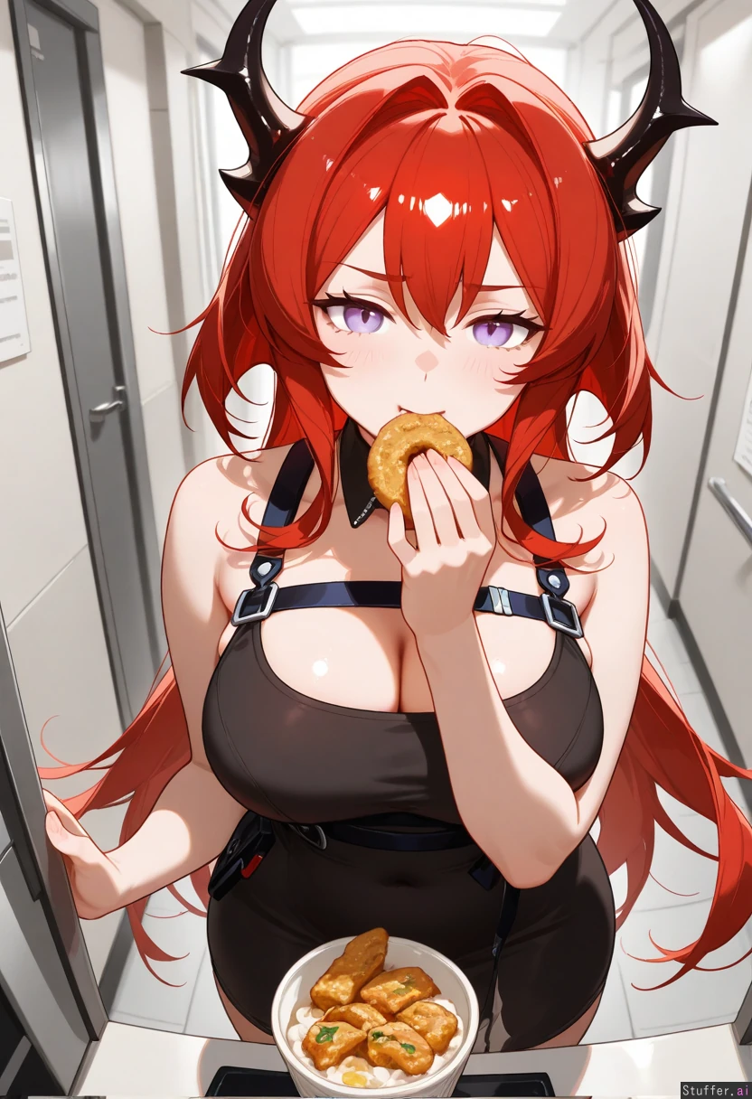 1girl, surtr (arknights), perfect quality, best quality, absolutely eye-catching, Sleeveless, plump, Standing, eating, half lidded eyes, furrowed brow, Hallway,