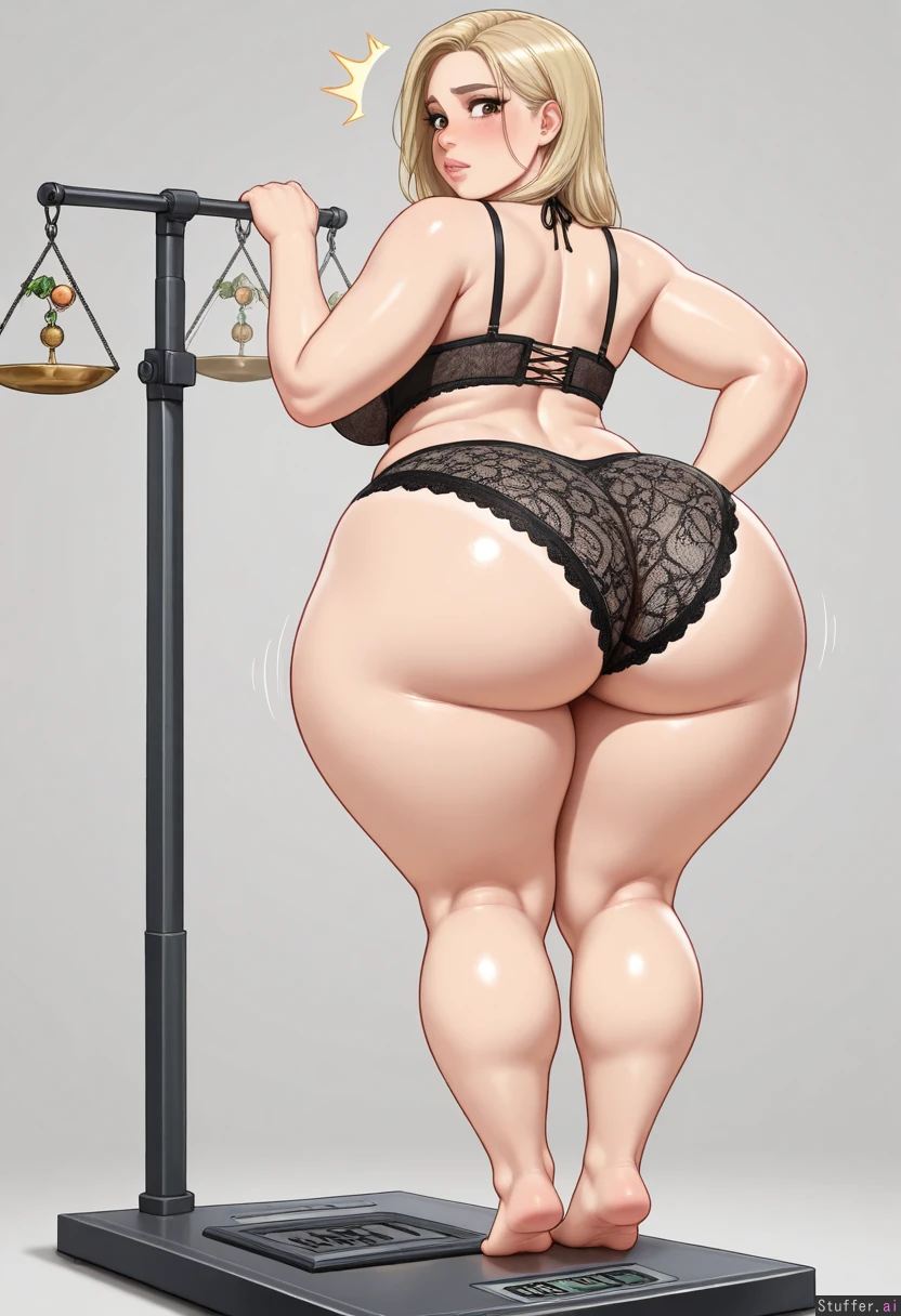 (Short thick Italian American girl), (plump:1.2), (bottom heavy body), ((hyper wide hips:1.9)), ((wide drooping ass:1.9)), (((soft plump hips:1.8))), (soft fat ass), ((plump hips:1.9)), ((love handles)), long straight blonde hair, (wide thick pouty full lips), seductive big brown eyes, best quality, masterpiece, amazing quality, realistic art, sciamano240\(artist\), blushyspicy\(artist\), luminyu\(artist\), rocksolidart\(artist\), (seen from behind:1.6), (back view:1.5), (((detailed feet))), (perfect hands), face focus, high resolution, deep colors, immersive background, ((standing on realistic weighing scale:1.46)), ((full body view), (((looking over shoulder))), (tight smooth peach skin), fat curvy hips, deep navel, intricate detail, highly detailed face, detailed lip filler, (((embarrassed)))), ((shocked)) bikini, skimpy goth lingerie, realistic perspective, detailed tan skin smaller torso, narrow shoulders, chubby arms, (voluptuous fattened up lower body), (huge plump lips), (luscious juicy pink lips)