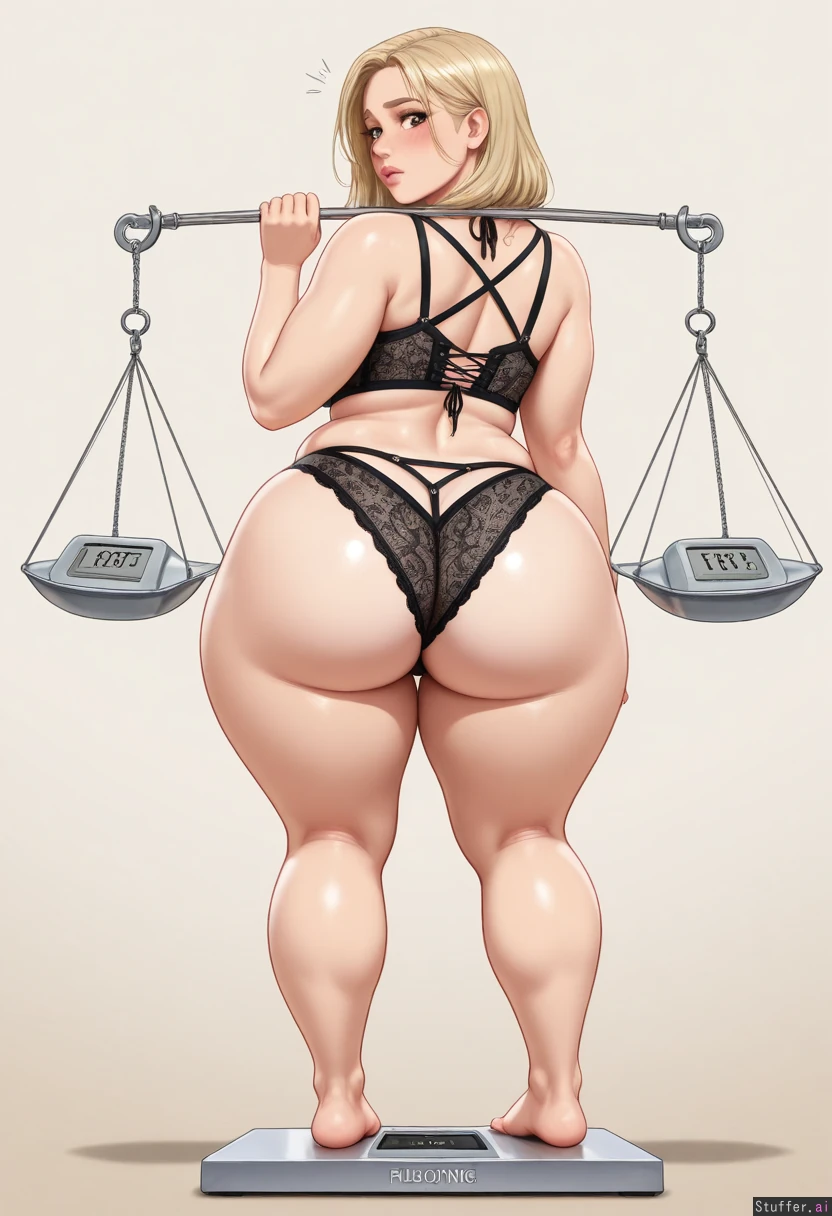 (Short Italian American girl), (plump:1.9), (bottom heavy body), ((hyper wide hips:1.9)), ((wide drooping ass:1.9)), (((soft plump hips:1.8))), (soft fat ass), ((plump hips:1.9)), ((love handles)), long straight blonde hair, (wide thick pouty full lips), seductive big brown eyes, best quality, masterpiece, amazing quality, realistic art, sciamano240\(artist\), blushyspicy\(artist\), luminyu\(artist\), rocksolidart\(artist\), (seen from behind:1.6), (back view:1.5), (((detailed feet))), (perfect hands), face focus, high resolution, deep colors, immersive background, ((standing on realistic weighing scale:1.46)), ((full body view), (((looking over shoulder))), (tight smooth peach skin), fat curvy hips, deep navel, intricate detail, highly detailed face, detailed lip filler, (((embarrassed)))), ((shocked)) bikini, skimpy goth lingerie, realistic perspective, detailed tan skin smaller torso, narrow shoulders, chubby arms, (voluptuous fattened up lower body), (huge plump lips), (luscious juicy pink lips)