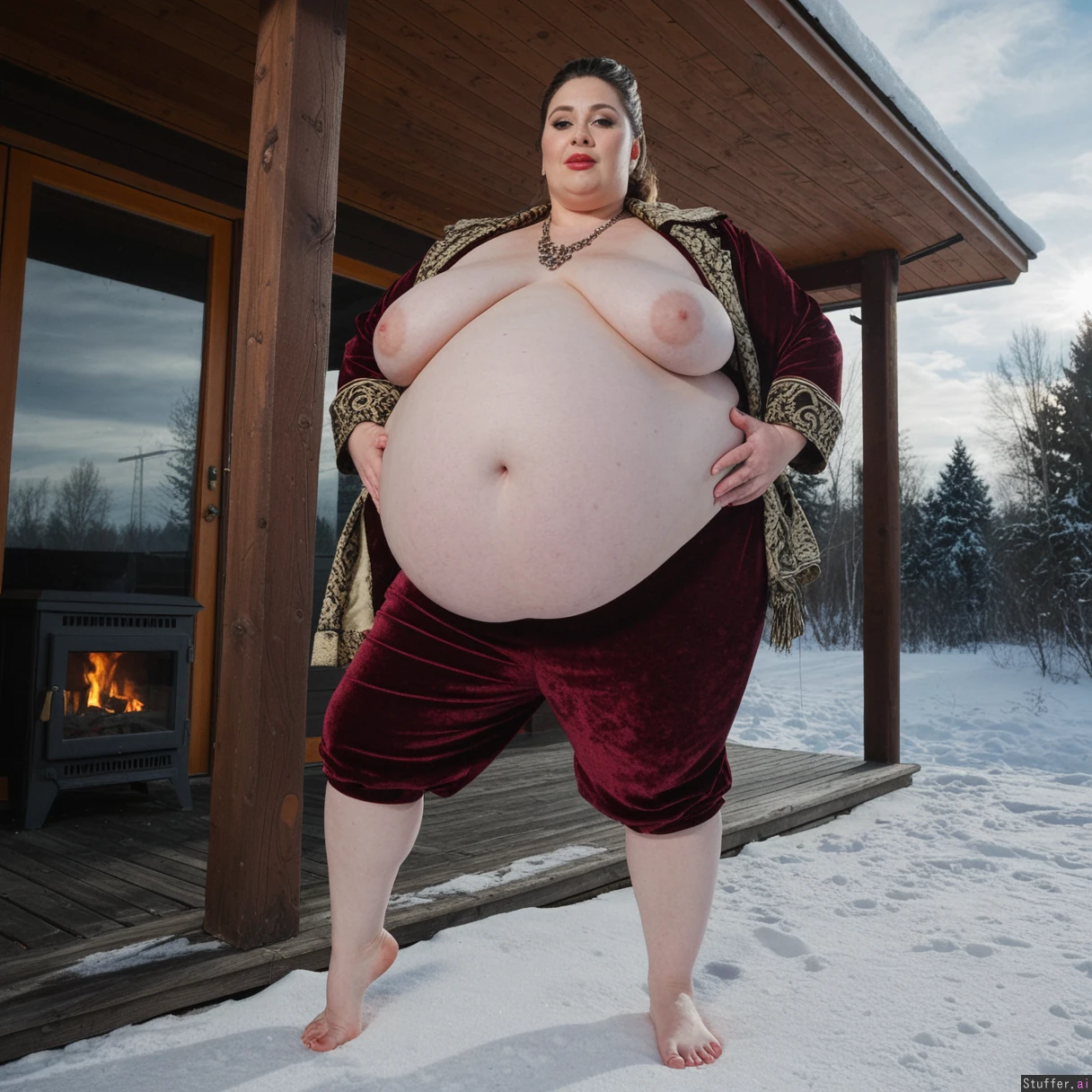 (A vintage portrait of subject walking casually under sun, snow effects, high contrast, cinematic set in 1980 Siberia style, emotional intensity), Extremely detailed ,(Middle aged hot milf, hot eyes,big_cheekbones,fat_lips,thick_eyebrows), (small tits,plump,bigass,fat arms, massive fat belly:1.1), (wearing fancy wooden clothing outfit ,fully clothed:1.3) ,(, looking desperately at viewer), (cinematic realistic universe:1.4),(feet, fullbody view :1.6), massive wooden modern glass house, fireplace, moody atmosphere, morning, river,( gigantic belly :1.6).