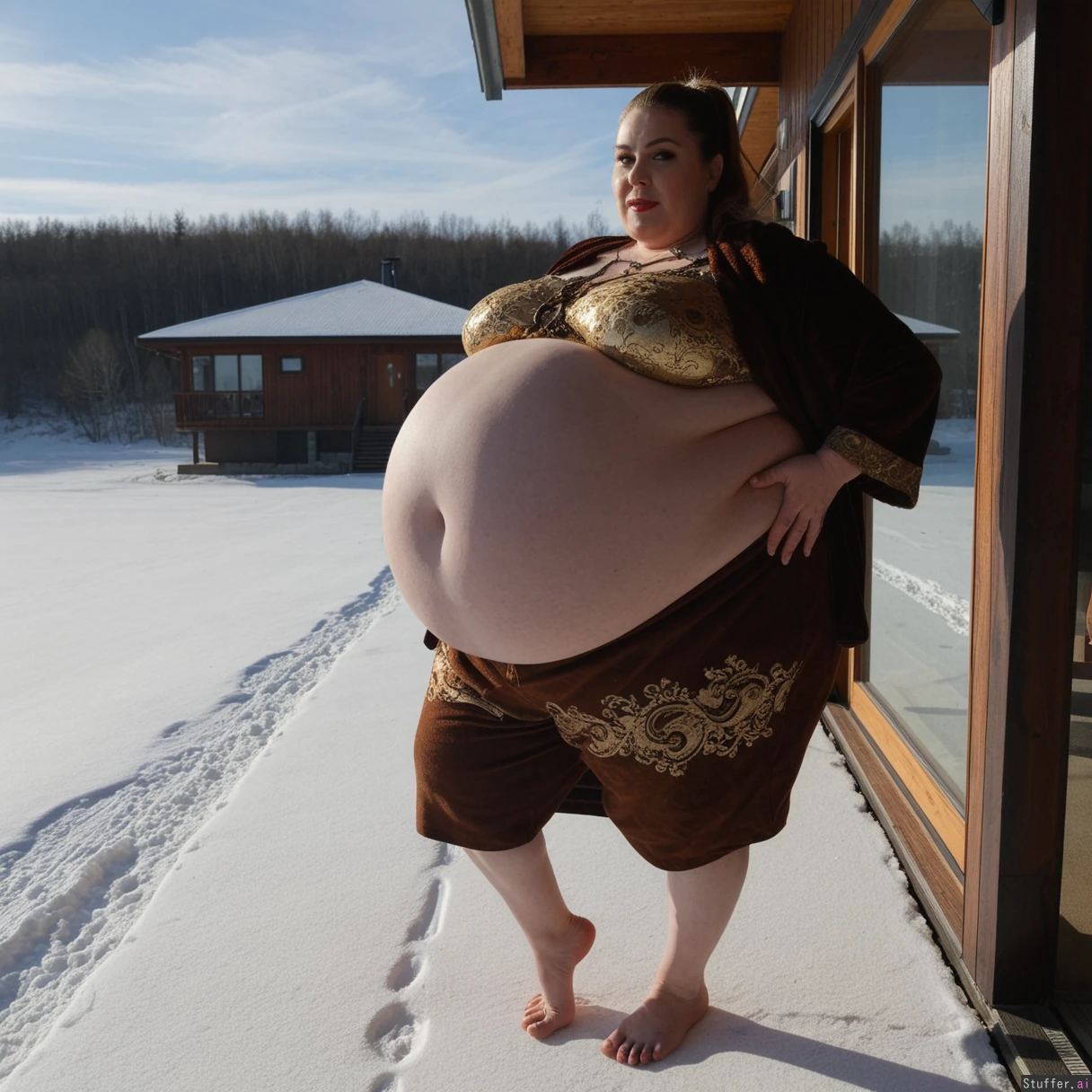(A vintage portrait of subject walking casually under sun, snow effects, high contrast, cinematic set in 1980 Siberia style, emotional intensity), Extremely detailed ,(Middle aged hot milf, hot eyes,big_cheekbones,fat_lips,thick_eyebrows), (small tits,plump,bigass,fat arms, massive fat belly:1.1), (wearing fancy wooden clothing outfit ,fully clothed:1.3) ,(, looking desperately at viewer), (cinematic realistic universe:1.4),(feet, fullbody view :1.6), massive wooden modern glass house, fireplace, moody atmosphere, morning, river,( gigantic belly :1.6).