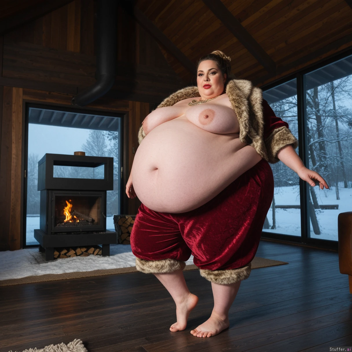(A vintage portrait of subject walking casually under sun, snow effects, high contrast, cinematic set in 1980 Europe style, emotional intensity), Extremely detailed ,(Middle aged hot milf, hot eyes,big_cheekbones,fat_lips,thick_eyebrows), (small tits,plump,bigass,fat arms, massive fat belly:1.1), (wearing fancy wooden clothing outfit ,fully clothed:1.3) ,(, looking desperately at viewer), (cinematic realistic universe:1.4),(feet, fullbody view :1.6), massive wooden modern glass house, fireplace, moody atmosphere, morning, river,( gigantic belly :1.6).