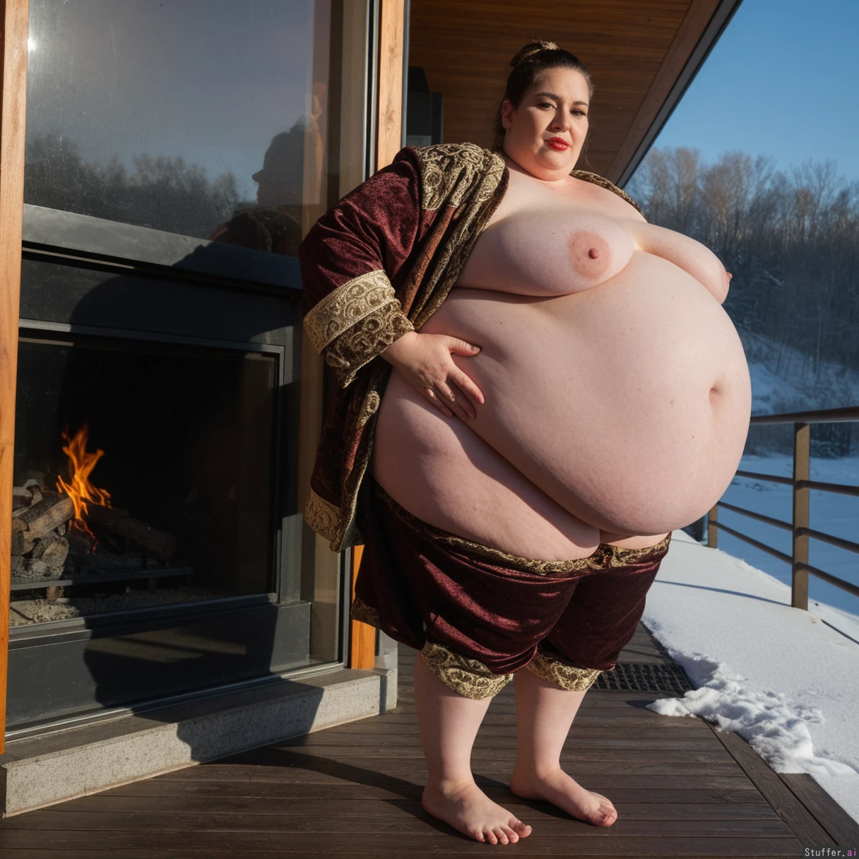 (A vintage portrait of subject walking casually under sun, snow effects, high contrast, cinematic set in 1980s Europe style, emotional intensity), Extremely detailed ,(Middle aged hot milf, hot eyes,big_cheekbones,fat_lips,thick_eyebrows), (small tits,plump,bigass,fat arms, massive fat belly:1.1), (wearing fancy wooden clothing outfit ,fully clothed:1.3) ,(, looking desperately at viewer), (cinematic realistic universe:1.4),(feet, fullbody view :1.6), massive wooden modern glass house, fireplace, moody atmosphere, morning, river,( gigantic belly :1.6).