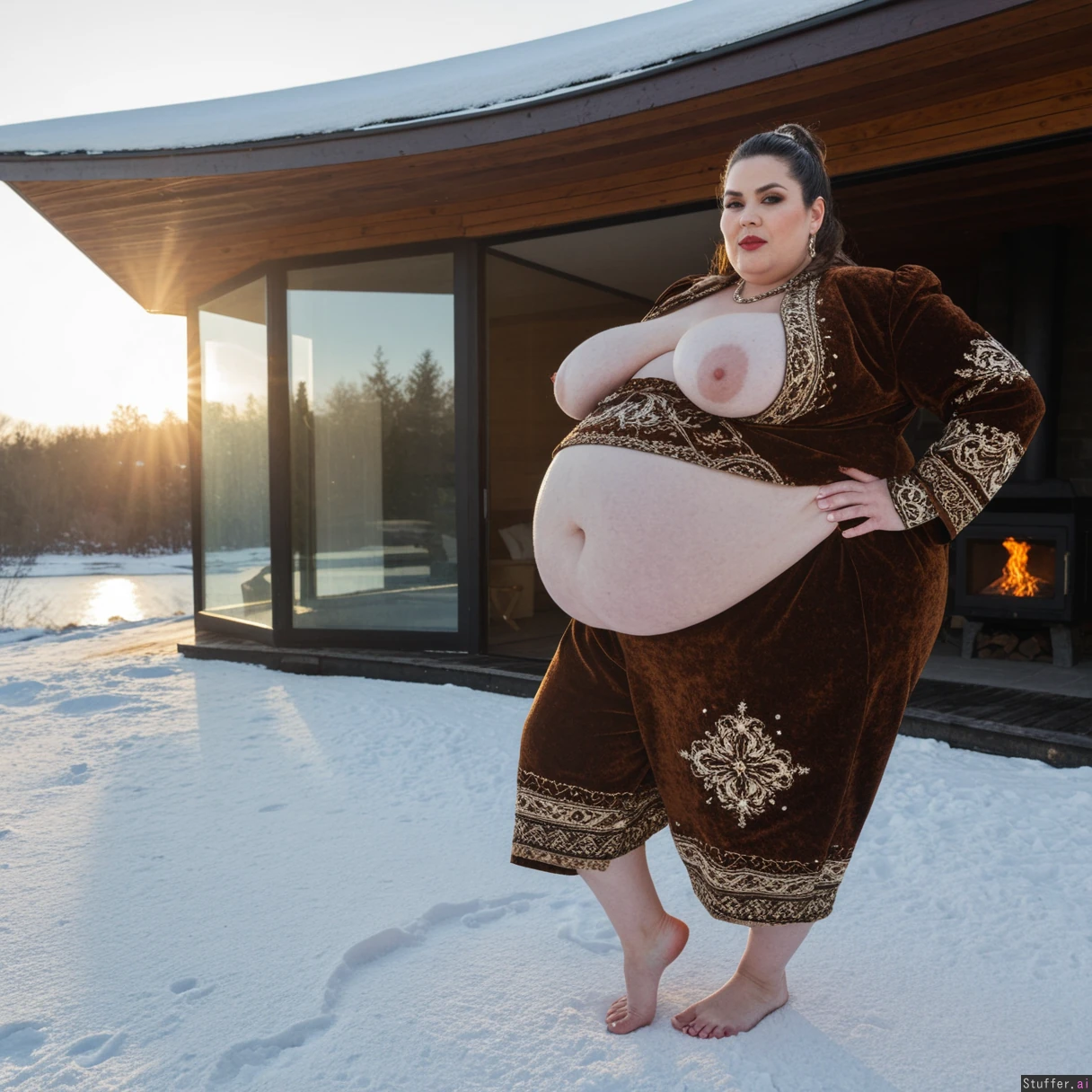 (A vintage portrait of subject walking casually under sun, snow effects, high contrast, cinematic set in 1980s style, emotional intensity), Extremely detailed ,(Middle aged hot milf, hot eyes,big_cheekbones,fat_lips,thick_eyebrows), (small tits,plump,bigass,fat arms, massive fat belly:1.1), (wearing fancy wooden clothing outfit ,fully clothed:1.3) ,(, looking desperately at viewer), (cinematic realistic universe:1.4),(feet, fullbody view :1.6), massive wooden modern glass house, fireplace, moody atmosphere, morning, river,( gigantic belly :1.6).