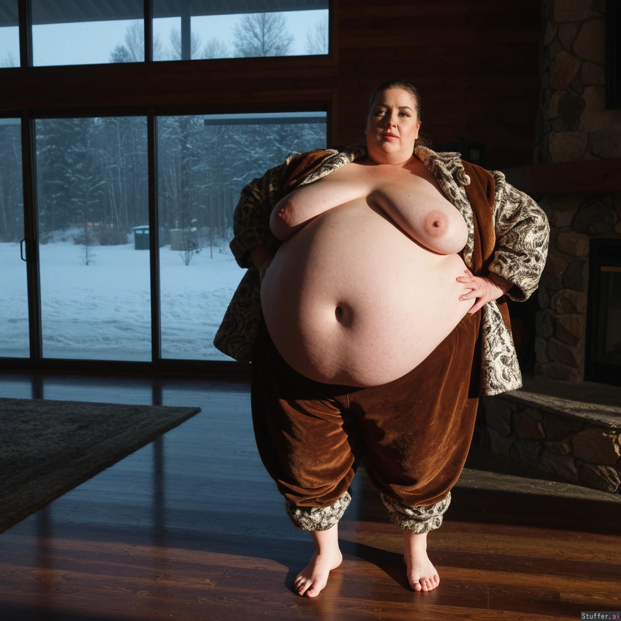 (A vintage portrait of subject walking casually under sun, snow effects, high contrast, cinematic set in 1980s style, emotional intensity), Extremely detailed ,(Middle aged hot milf, hot eyes,big_cheekbones,fat_lips,thick_eyebrows), (small tits,plump,bigass,fat arms, massive fat belly:1.1), (wearing fancy wooden clothing outfit ,fully clothed:1.3) ,(, looking desperately at viewer), (cinematic realistic universe:1.4),(feet, fullbody view :1.6), massive wooden modern glass house, fireplace, moody atmosphere, morning, river,( gigantic belly :1.6).