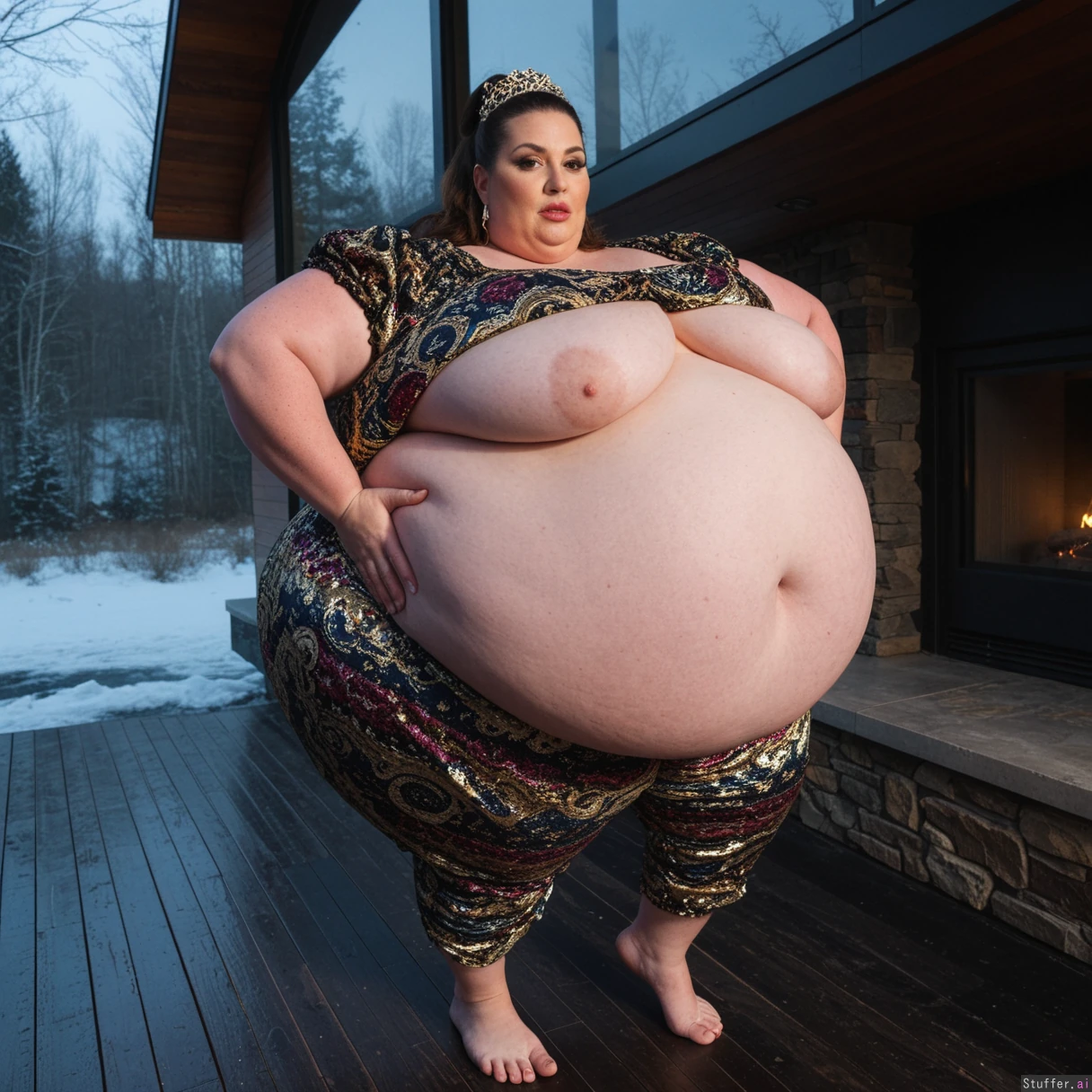 (A vintage portrait of subject walking casually under sun, snow effects, high contrast, cinematic set in 1980s style, emotional intensity), Extremely detailed ,(Middle aged hot milf, hot eyes,big_cheekbones,fat_lips,thick_eyebrows), (small tits,plump,bigass,fat arms, massive fat belly:1.1), (wearing fancy clothing outfit ,fully clothed:1.3) ,(, looking desperately at viewer), (cinematic realistic universe:1.4),(feet, fullbody view :1.6), massive wooden modern glass house, fireplace, moody atmosphere, morning, river,( gigantic belly :1.6).