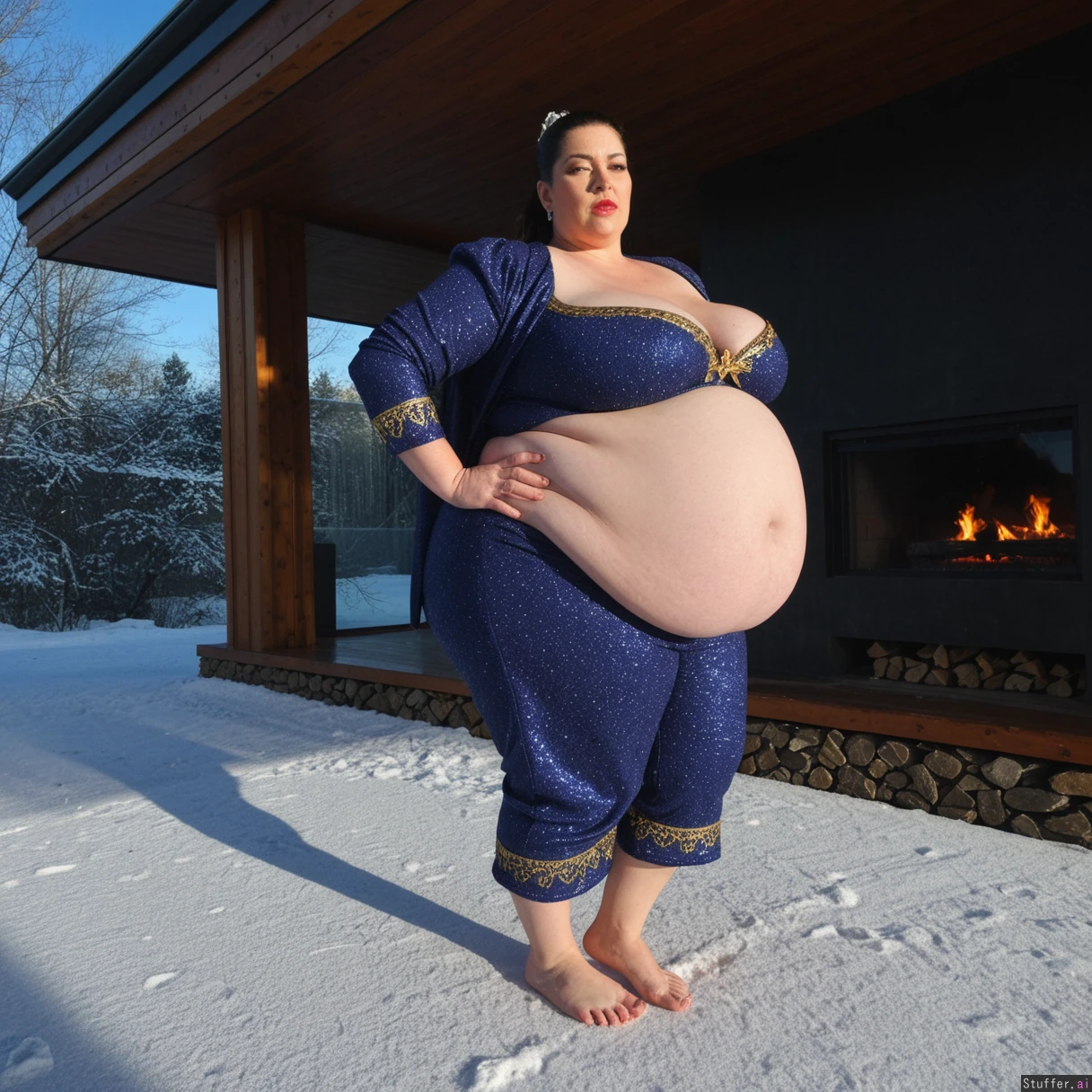 (A vintage portrait of subject walking casually under sun, snow effects, high contrast, cinematic set in Spain style, emotional intensity), Extremely detailed ,(Middle aged hot milf, hot eyes,big_cheekbones,fat_lips,thick_eyebrows), (small tits,plump,bigass,fat arms, massive fat belly:1.1), (wearing fantasy clothing outfit ,fully clothed:1.3) ,(, looking desperately at viewer), (cinematic realistic universe:1.4),(feet, fullbody view :1.6), massive wooden modern glass house, fireplace, moody atmosphere, morning, river,( gigantic belly :1.6).