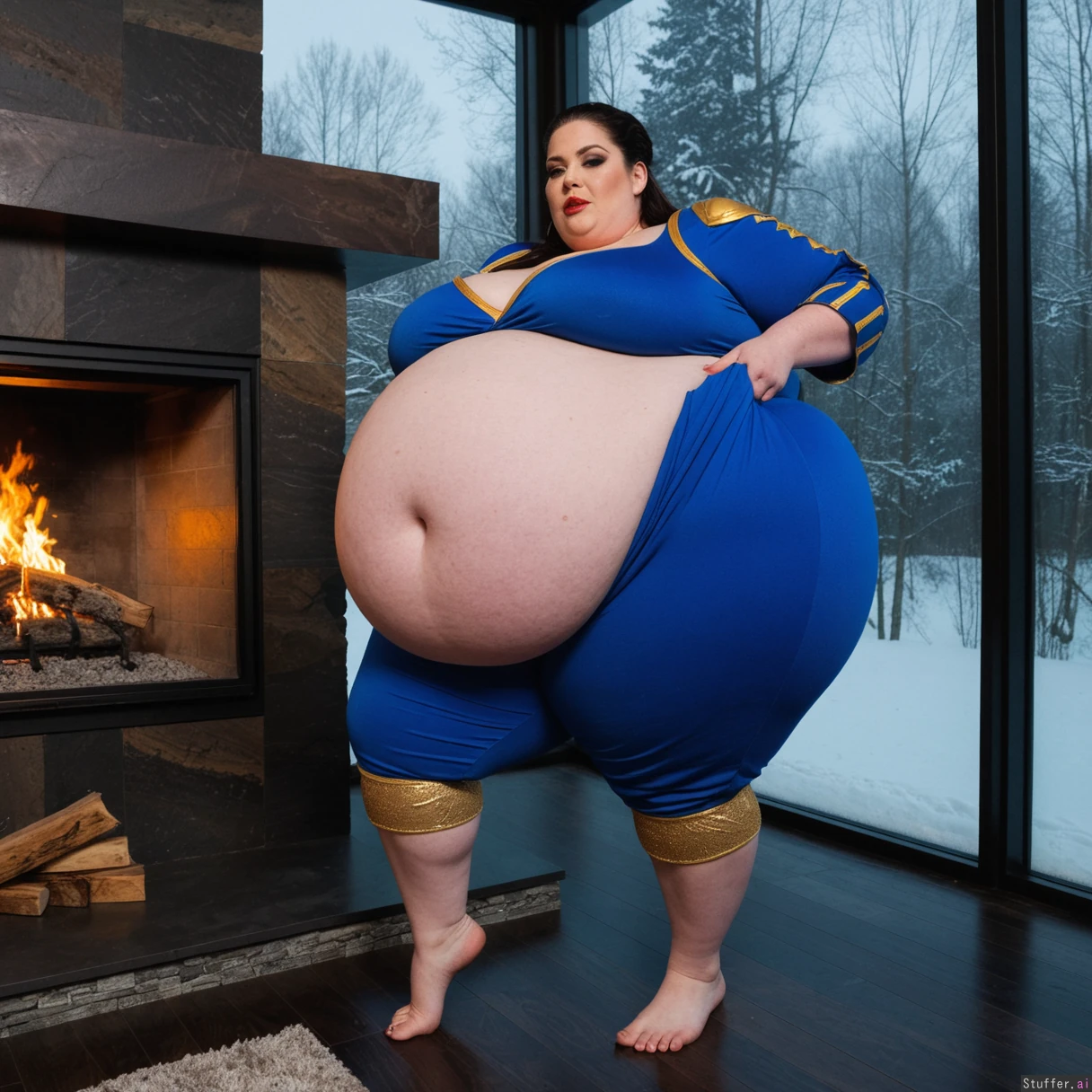 (A vintage portrait of subject walking casually under sun, snow effects, high contrast, cinematic set in America style, emotional intensity), Extremely detailed ,(Middle aged hot milf, hot eyes,big_cheekbones,fat_lips,thick_eyebrows), (small tits,plump,bigass,fat arms, massive fat belly:1.1), (wearing fantasy clothing outfit ,fully clothed:1.3) ,(, looking desperately at viewer), (cinematic realistic universe:1.4),(feet, fullbody view :1.6), massive wooden modern glass house, fireplace, moody atmosphere, morning, river,( gigantic belly :1.6).