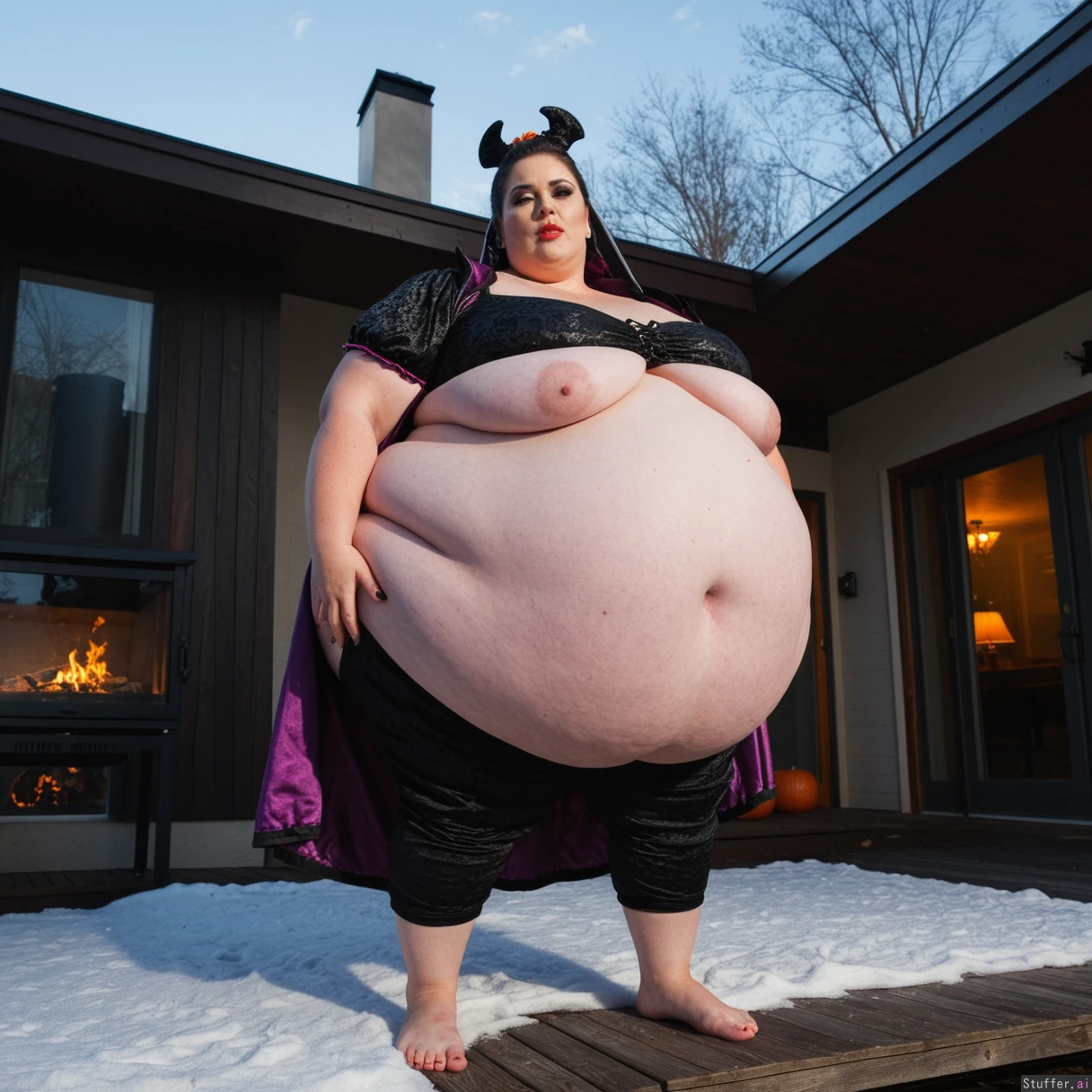 (A vintage portrait of subject walking casually under sun, snow effects, high contrast, cinematic set in America style, emotional intensity), Extremely detailed ,(Middle aged hot milf, hot eyes,big_cheekbones,fat_lips,thick_eyebrows), (small tits,plump,bigass,fat arms, massive fat belly:1.1), (wearing fantasy Halloween clothing outfit ,fully clothed:1.3) ,(, looking desperately at viewer), (cinematic realistic universe:1.4),(feet, fullbody view :1.6), massive wooden modern glass house, fireplace, moody atmosphere, morning, river,( gigantic belly :1.6).