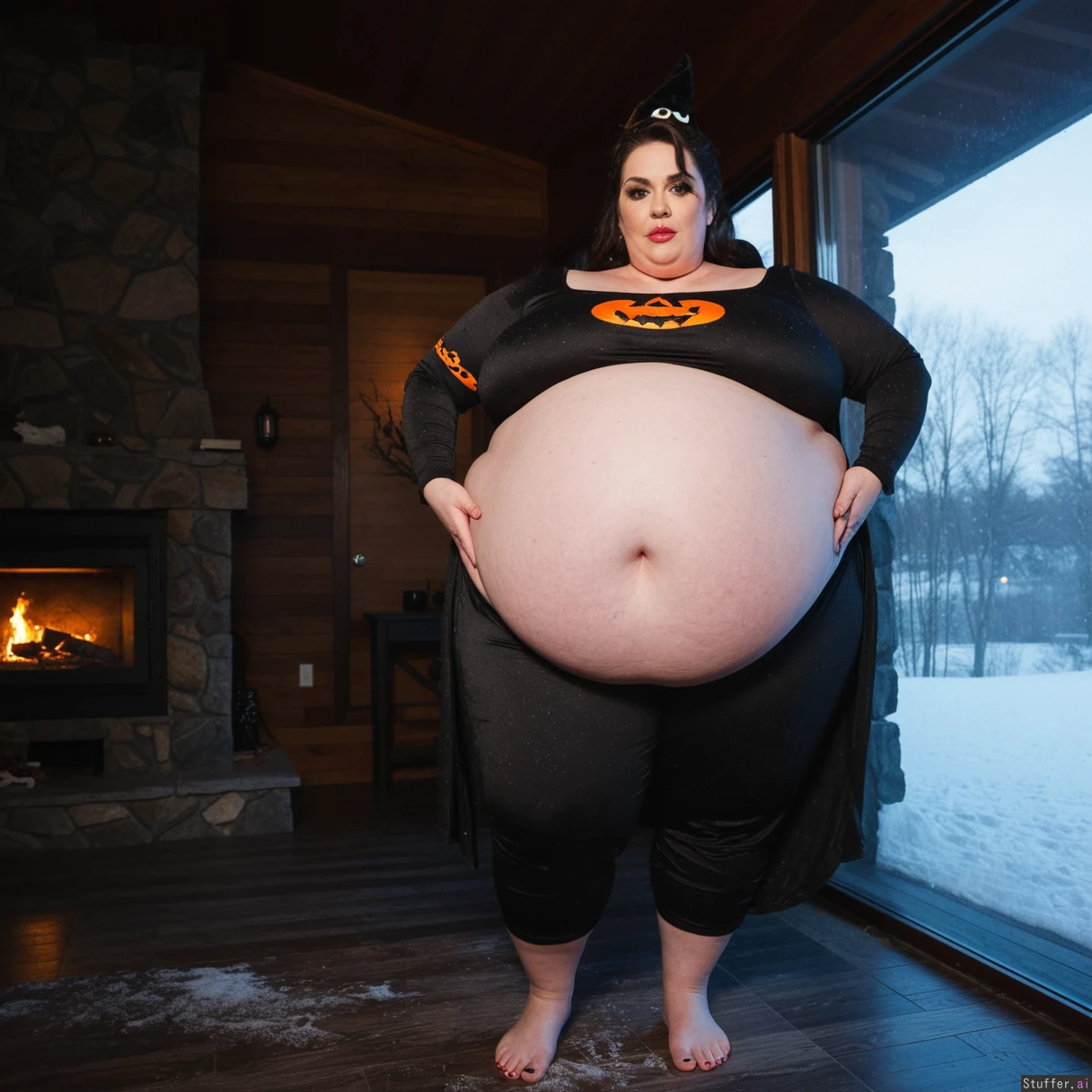 (A vintage portrait of subject walking casually under sun, snow effects, high contrast, cinematic set in America style, emotional intensity), Extremely detailed ,(Middle aged hot milf, hot eyes,big_cheekbones,fat_lips,thick_eyebrows), (small tits,plump,bigass,fat arms, massive fat belly:1.1), (wearing Halloween clothing outfit ,fully clothed:1.3) ,(, looking desperately at viewer), (cinematic realistic universe:1.4),(feet, fullbody view :1.6), massive wooden modern glass house, fireplace, moody atmosphere, morning, river,( gigantic belly :1.6).