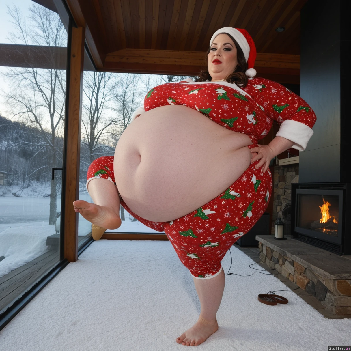 (A vintage portrait of subject walking casually under sun, snow effects, high contrast, cinematic set in America style, emotional intensity), Extremely detailed ,(Middle aged hot milf, hot eyes,big_cheekbones,fat_lips,thick_eyebrows), (small tits,plump,bigass,fat arms, massive fat belly:1.1), (wearing Christmas clothing outfit ,fully clothed:1.3) ,(, looking desperately at viewer), (cinematic realistic universe:1.4),(feet, fullbody view :1.6), massive wooden modern glass house, fireplace, moody atmosphere, morning, river,( gigantic belly :1.6).