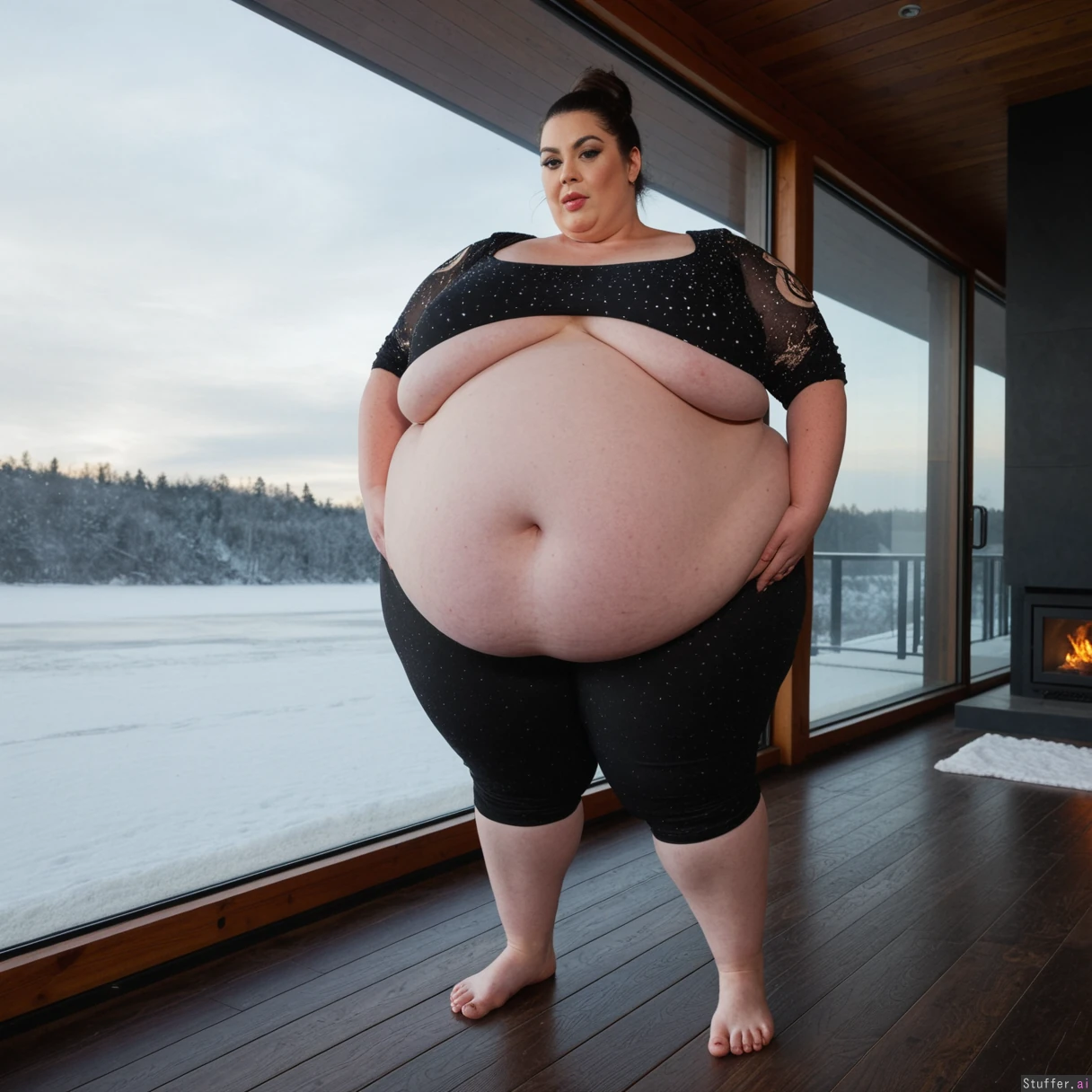 (A vintage portrait of subject walking casually under sun, snow effects, high contrast, cinematic set in America style, emotional intensity), Extremely detailed ,(Middle aged hot milf, hot eyes,big_cheekbones,fat_lips,thick_eyebrows), (small tits,plump,bigass,fat arms, massive fat belly:1.1), (wearing custom clothing outfit ,fully clothed:1.3) ,(, looking desperately at viewer), (cinematic realistic universe:1.4),(feet, fullbody view :1.6), massive wooden modern glass house, fireplace, moody atmosphere, morning, river,( gigantic belly :1.6).
