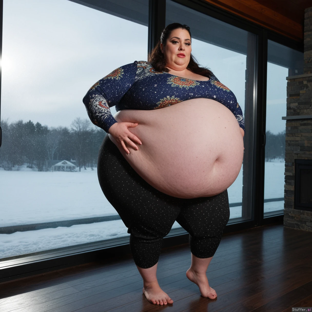 (A vintage portrait of subject walking casually under sun, snow effects, high contrast, cinematic set in America style, emotional intensity), Extremely detailed ,(Middle aged hot milf, hot eyes,big_cheekbones,fat_lips,thick_eyebrows), (small tits,plump,bigass,fat arms, massive fat belly:1.1), (wearing custom clothing outfit ,fully clothed:1.3) ,(, looking desperately at viewer), (cinematic realistic universe:1.4),(feet, fullbody view :1.6), massive wooden modern glass house, fireplace, moody atmosphere, morning, river,( gigantic belly :1.6).