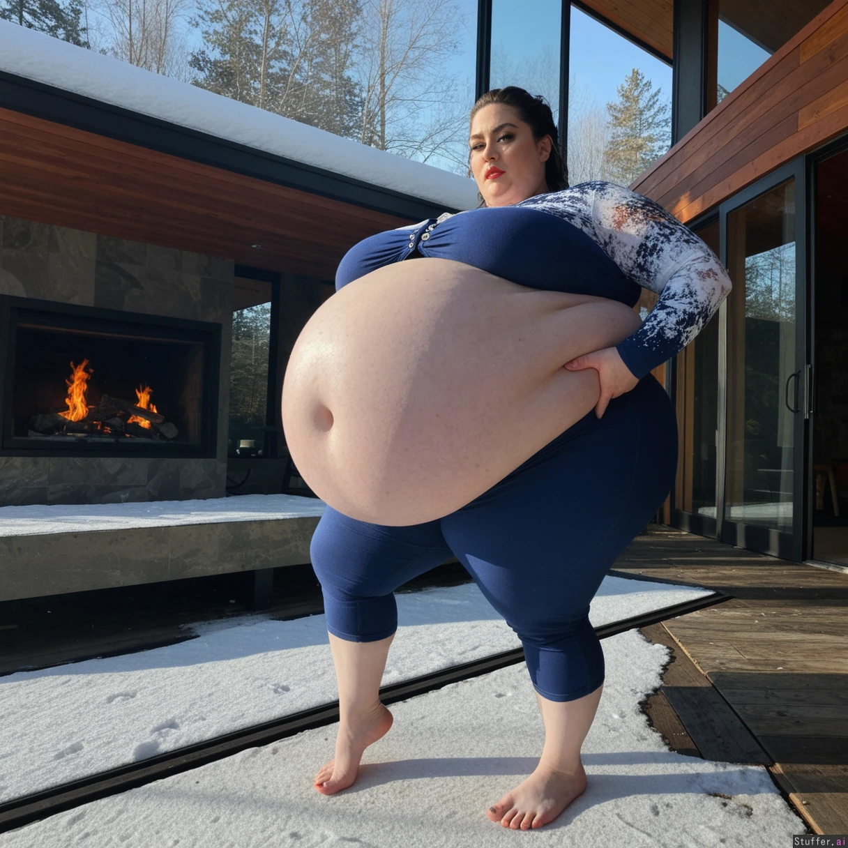 (A vintage portrait of subject walking casually under sun, snow effects, high contrast, cinematic set in America style, emotional intensity), Extremely detailed ,(Middle aged hot milf, hot eyes,big_cheekbones,fat_lips,thick_eyebrows), (small tits,plump,bigass,fat arms, massive fat belly:1.1), (wearing custom clothing outfit ,fully clothed:1.3) ,(, looking desperately at viewer), (cinematic realistic universe:1.4),(feet, fullbody view :1.6), massive wooden modern glass house, fireplace, moody atmosphere, morning, river,( gigantic belly :1.6).